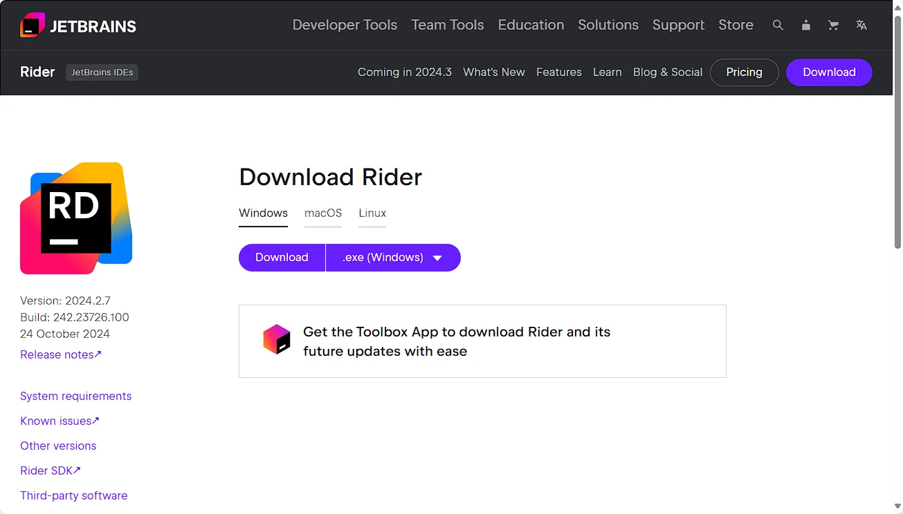 Zunächst möchte ich euch kurz zeigen, wie ihr die IDE unter Windows installieren könnt. Anders als Visual Studio steht Rider nämlich nicht nur für Windows, sondern auch für Linux und macOS zur Verfügung. Gerade auf macOS ist Rider ein sehr beliebter Ersatz für das eingestellte Visual Studio for Mac.