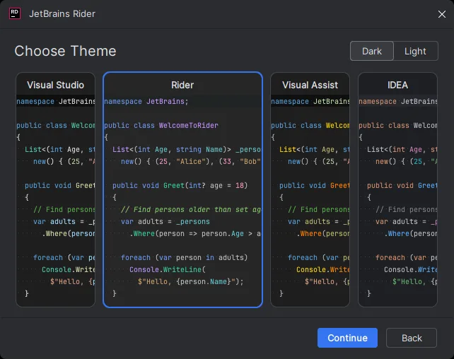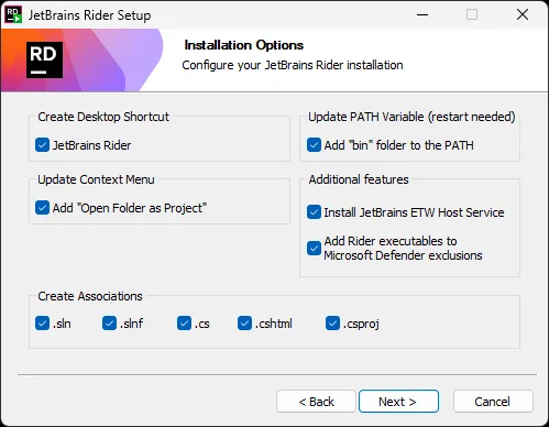 Während der Installation gibt es eine Möglichkeit zur Einstellung, wie z.B. das Verlinken von Datei-Endungen mit JetBrains Rider.