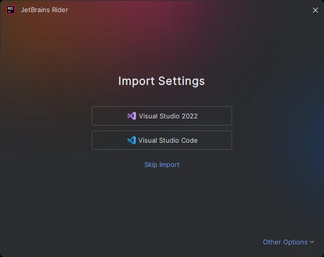 Nun können wir mit der Konfiguration beginnen. Zunächst können Einstellungen von Visual Studio oder Visual Studio Code importiert werden. Diese Optionen stehen einem nur zur Verfügung, sofern man eines der beiden Programme bereits auf seinem Rechner installiert hat.