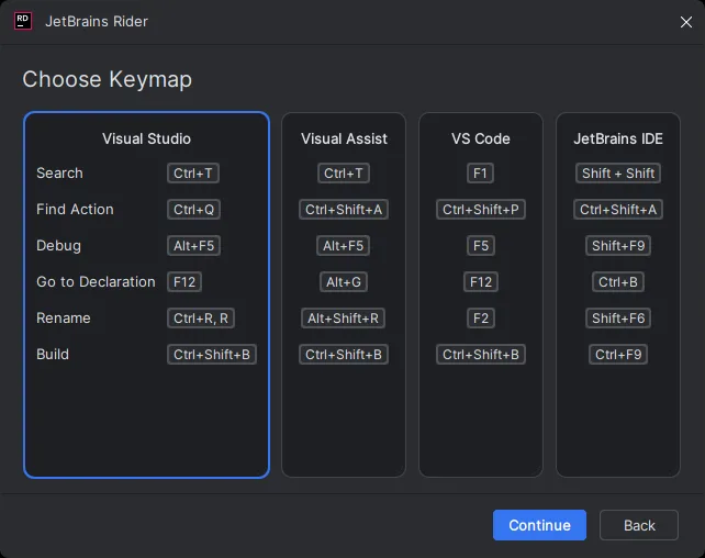 Nun können wir uns noch um das Thema Shortcuts kümmern. Da ich jahrelang Visual Studio genutzt habt, nutze ich einfach die gleichen Key-Bindings wie Visual Studio.