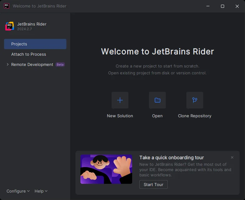 Nun ist es geschafft und Rider ist konfiguriert. Über den Button New Solution können wir nun ein neues Projekt in Rider anlegen.