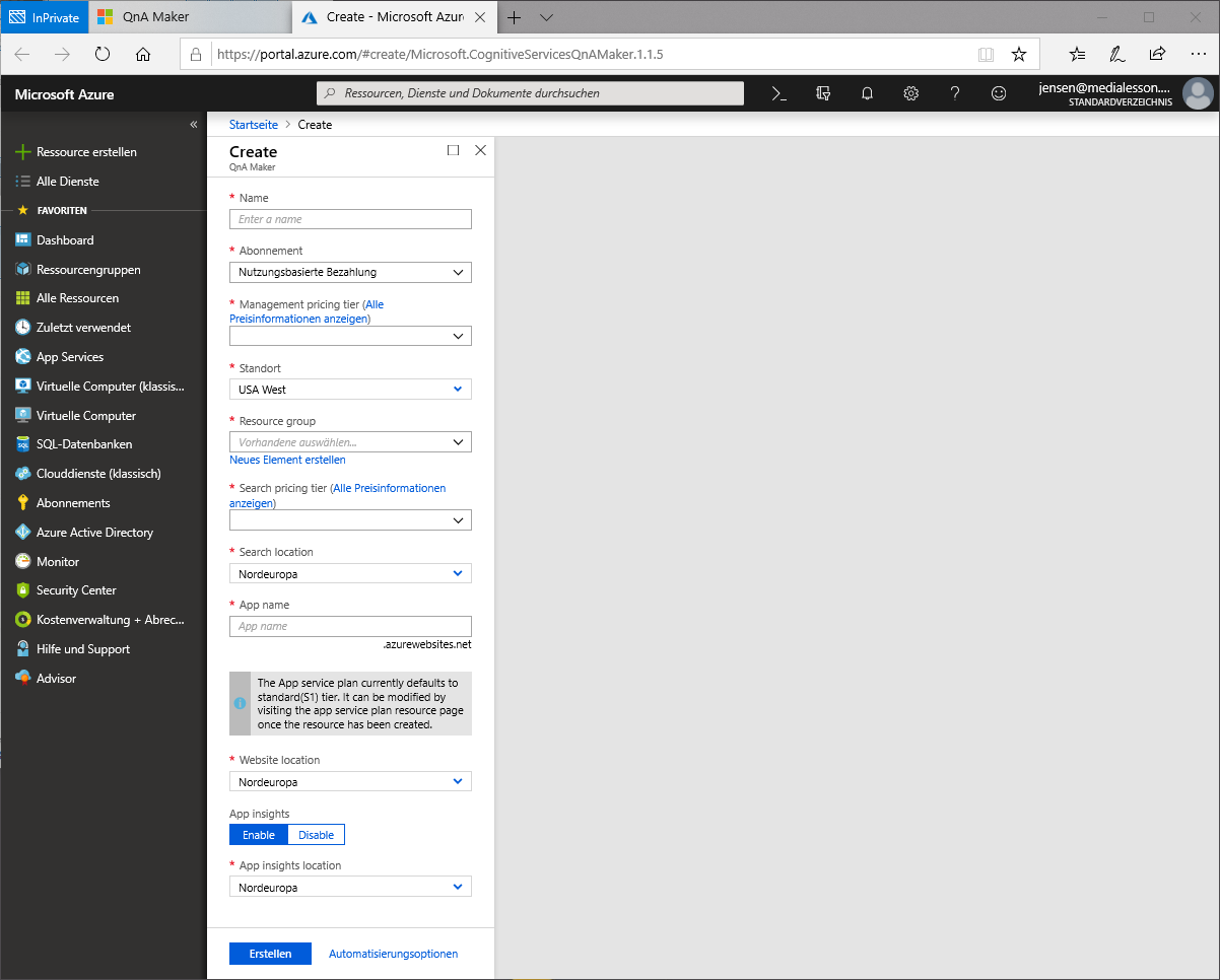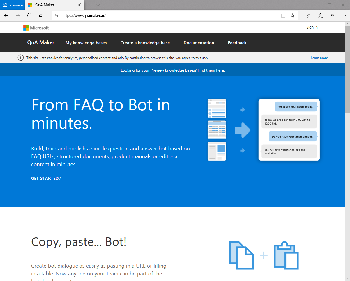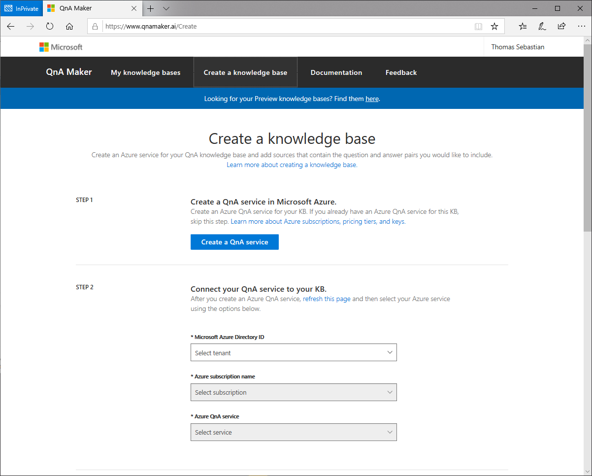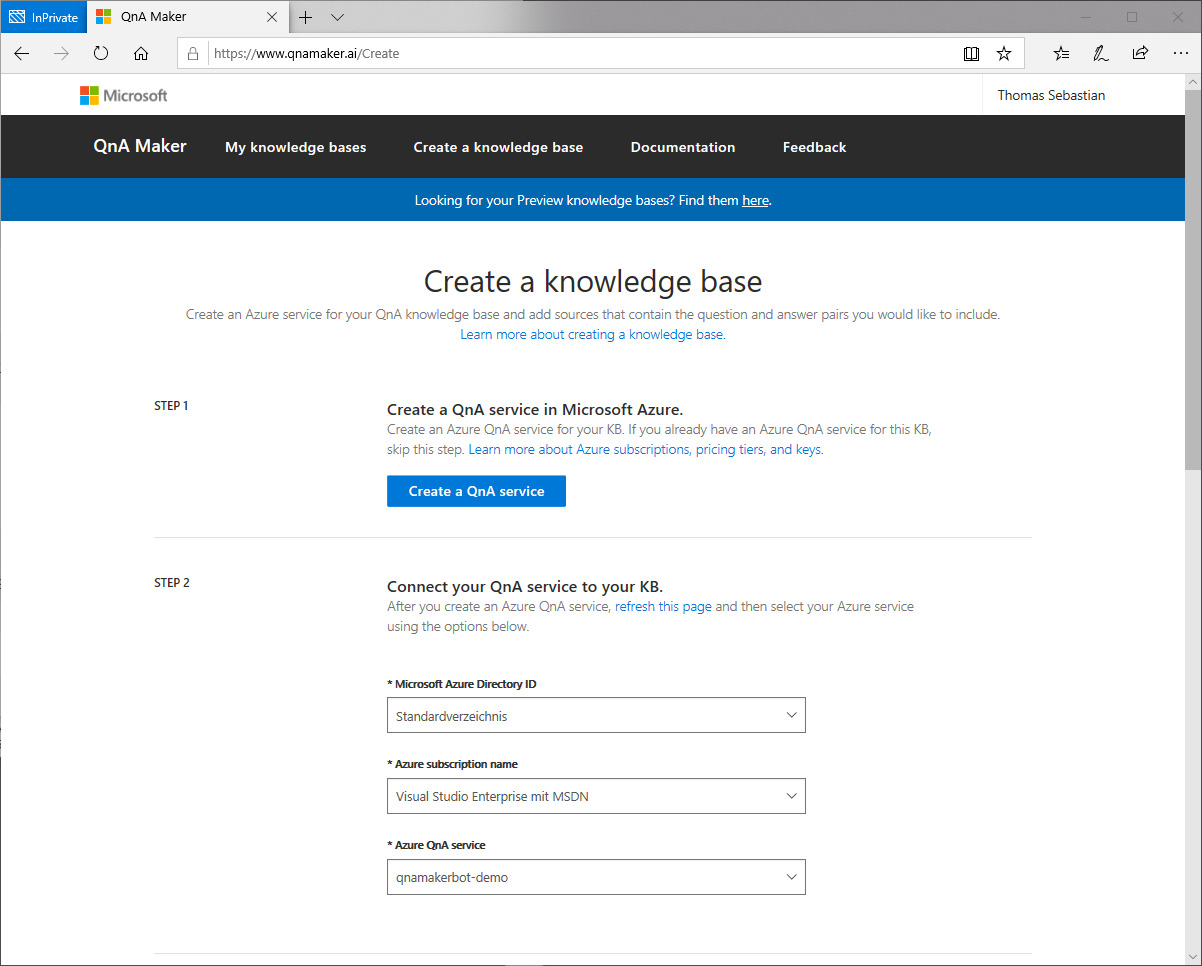 Der Einstiegspunkt ist dabei die Webseite https://qnamaker.ai .