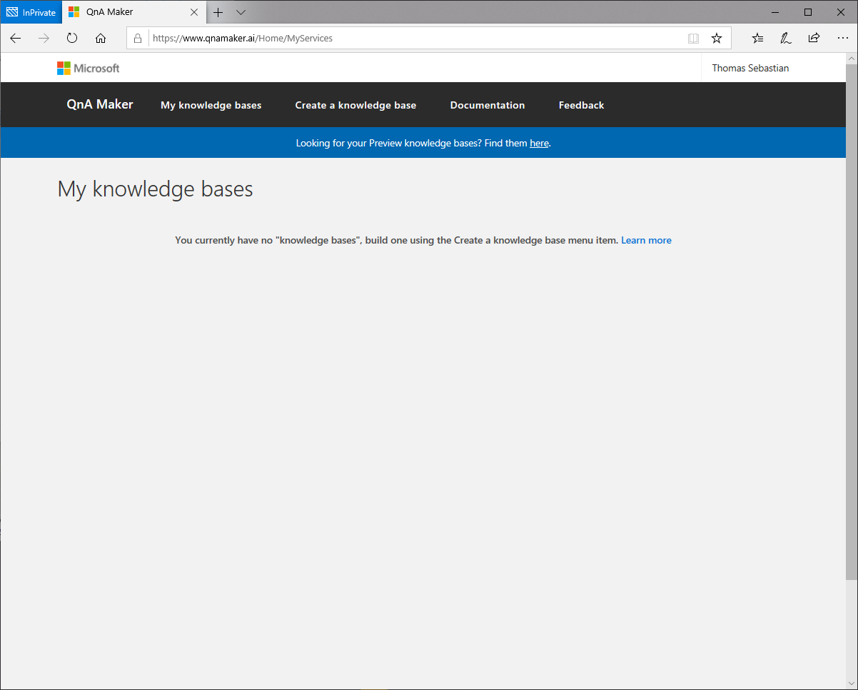 Nach der Anmeldung wird man automatisch in den Bereich My knowledge bases weitergeleitet. Da ich vorher noch nicht mit diesem Dienst gearbeitet habe, ist der Bereich derzeit leer und es wird nichts weiter angezeigt.