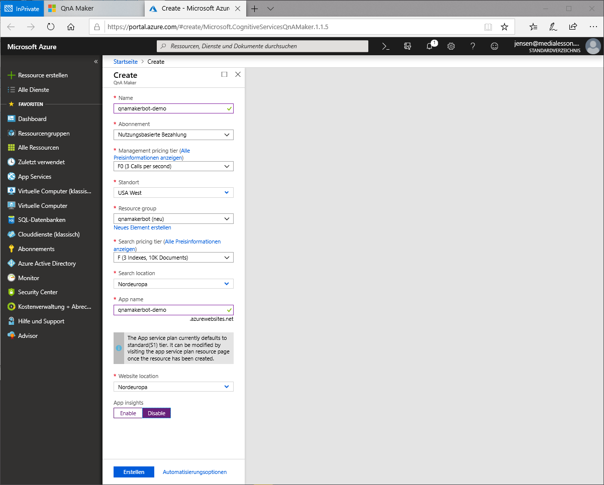 Anschließend können wir das Azure-Portal wieder schließen und gelangen zurück in den Erstellungsprozess unseres Bots. Innerhalb von Step 2 klicken wir auf den Link refresh this page und können dann aus den Drop-Downs unseren neu erstellten Service auswählen.