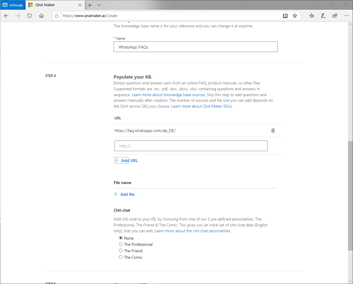 Im dritten Schritt definieren wir einen Namen für unsere Knowledge Base. Für diesen Beispiel-Bot wähle ich WhatsApp FAQs, da ich später die FAQs von WhatsApp in meinem Bot verwenden möchte. Anschließend füge ich im vierten Schritt noch die Url zu den FAQs hinzu, welche in diesem Fall https://faq.whatsapp.com/de_DE/ lautet.