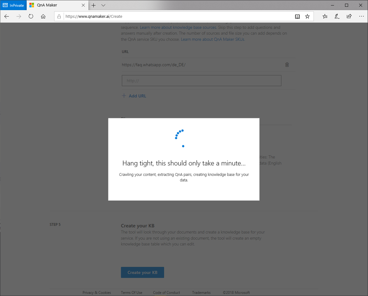 Anschließend starten wir den Generierungsprozess über den Button Create your KB. Dieser Vorgang kann ein paar Minuten dauern.
