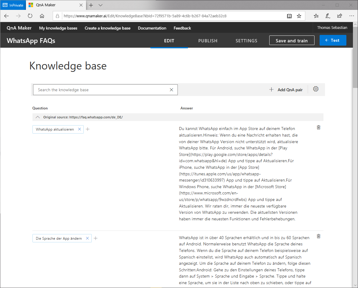 Wir erhalten nach diesem Prozess Zugriff auf unsere Knowledge Base, wo die geparsten Fragen und Antworten aus der FAQ-Webseite von WhatsApp übersichtlich dargestellt werden. Im linken Bereich steht die Frage, also das was der Nutzer später unseren Bot fragt und im rechten Bereich steht die passenden Antwort. Die ganzen Angaben lassen sich aber auch bequem editieren, also neue Frage hinzufügen oder die Antwort kürzen bzw. ergänzen. Über den Button Add QnA pair können aber auch neue Einträge bequem hinzugefügt werden.