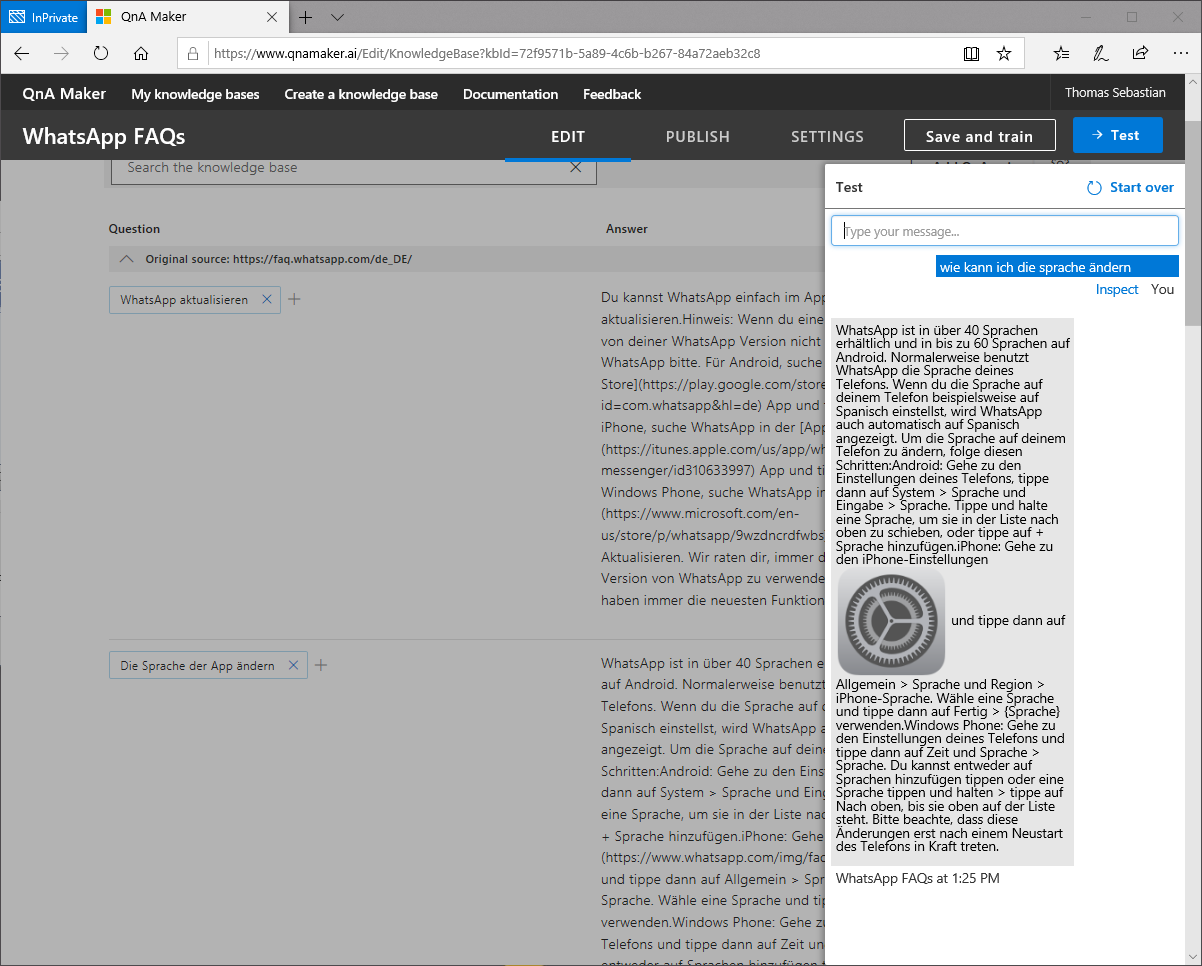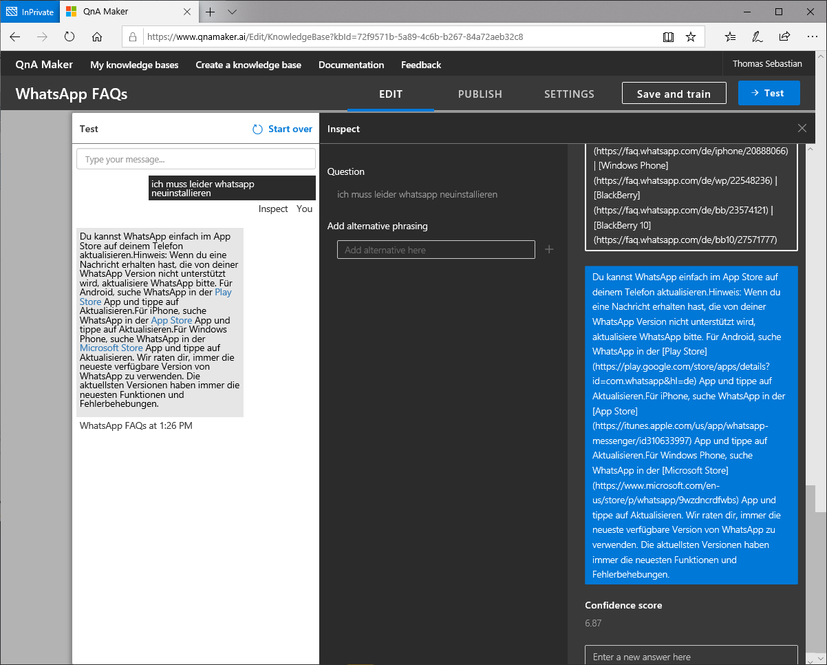 Damit haben wir jetzt unsere Knowledge Base für das Einbinden in einen Bot vorbereitet. Wie man das ganze nun in einem Bot verwendet, werde ich in einem späteren Beitrag zeigen.
