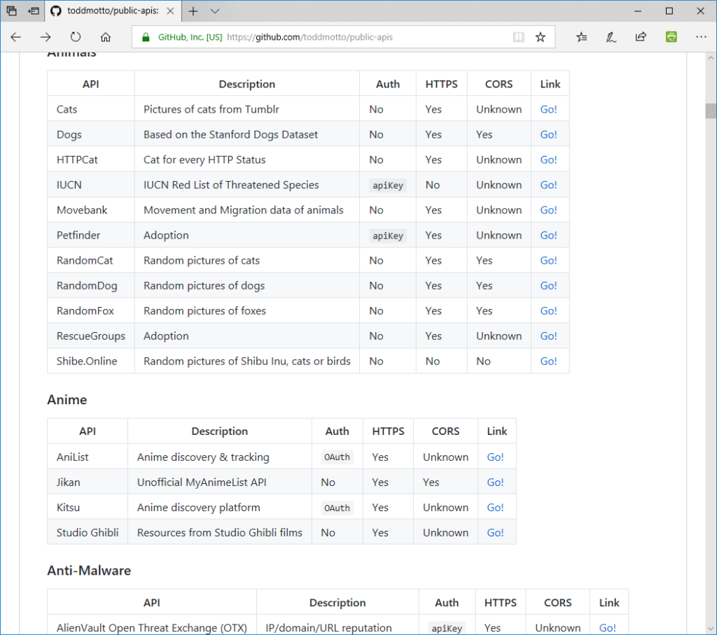 Als Entwickler stand ich schon öfters vor dem Problem, welche APIs gibt es bereits auf dem Markt und welche lassen sich dadurch vielleicht auch relativ einfach in eigenen App-Projekten verwenden. Eine einfache Suche nach JSON API liefert nicht immer das passende Ergebnis und man muss teilweise sehr genau wissen, wonach man sucht um eine passende API zu finden. Hier kommt nun aber Projekt Public APIs von Todd Motto ins Spiel, denn dieser hat in einem GitHub-Repository eine Vielzahl von APIs aufgeführt, welche man schnell und einfach verwenden kann.