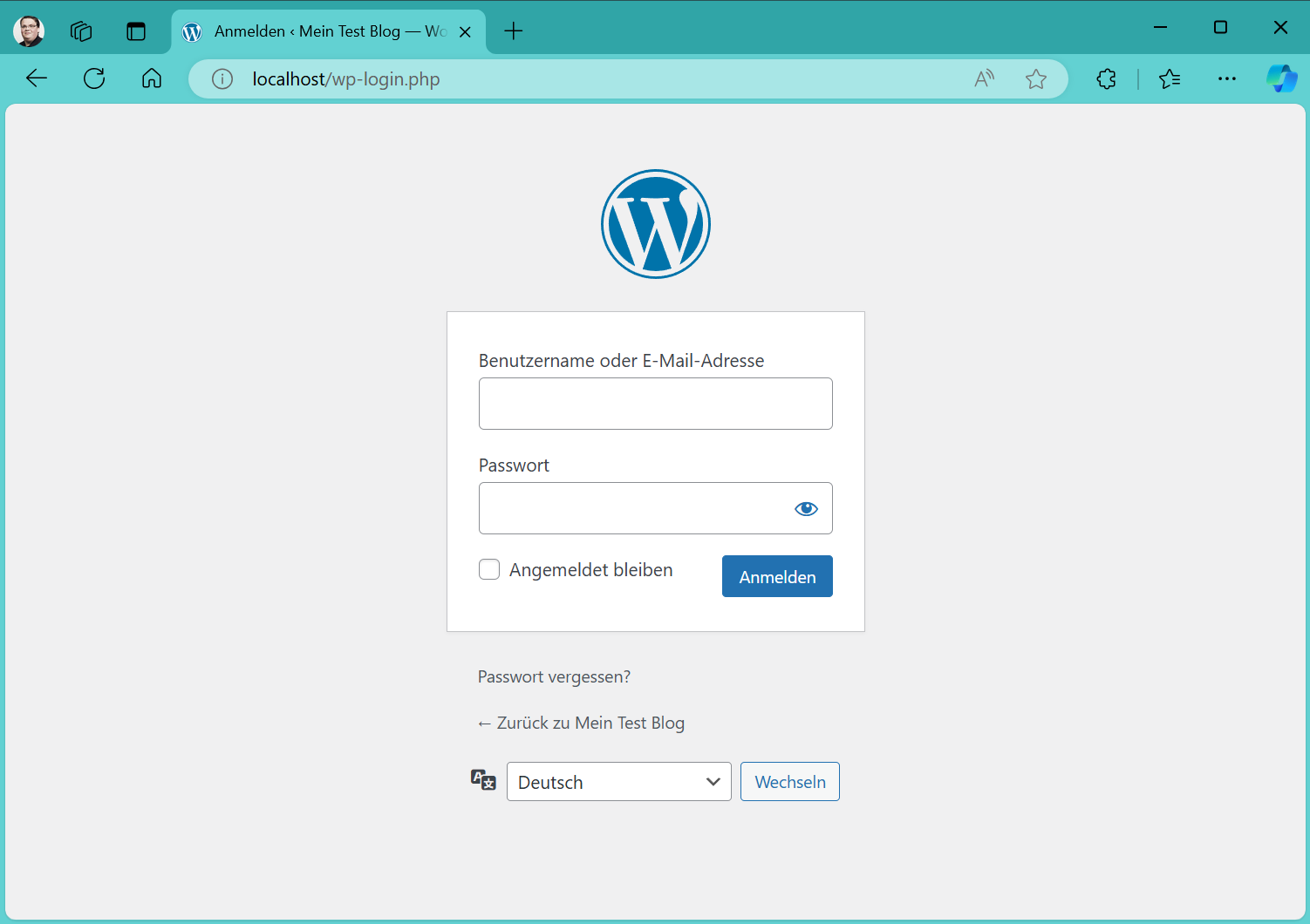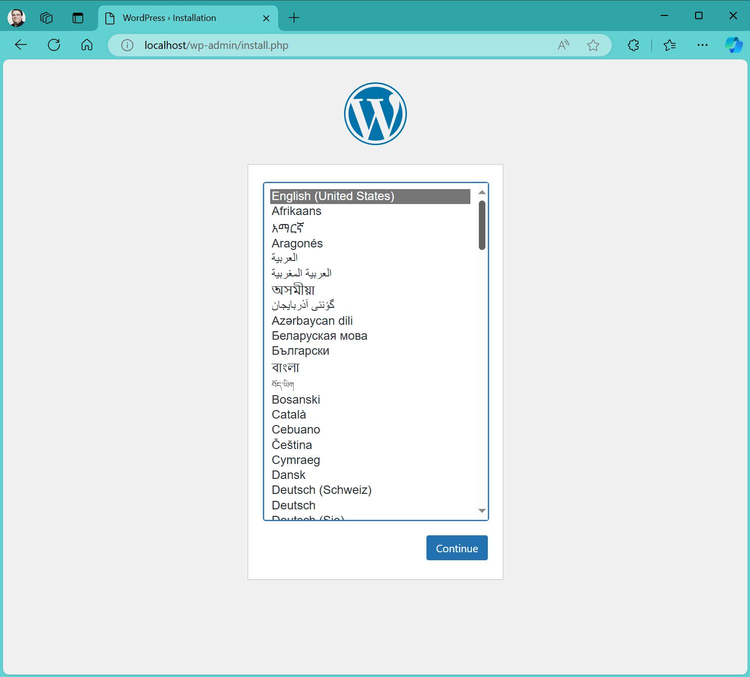 Sobald die Container ausgeführt werden, kannst du im Browser http://localhost aufrufen, um den Installationsprozess von WordPress zu starten. Du wirst nach einer Sprache gefragt.