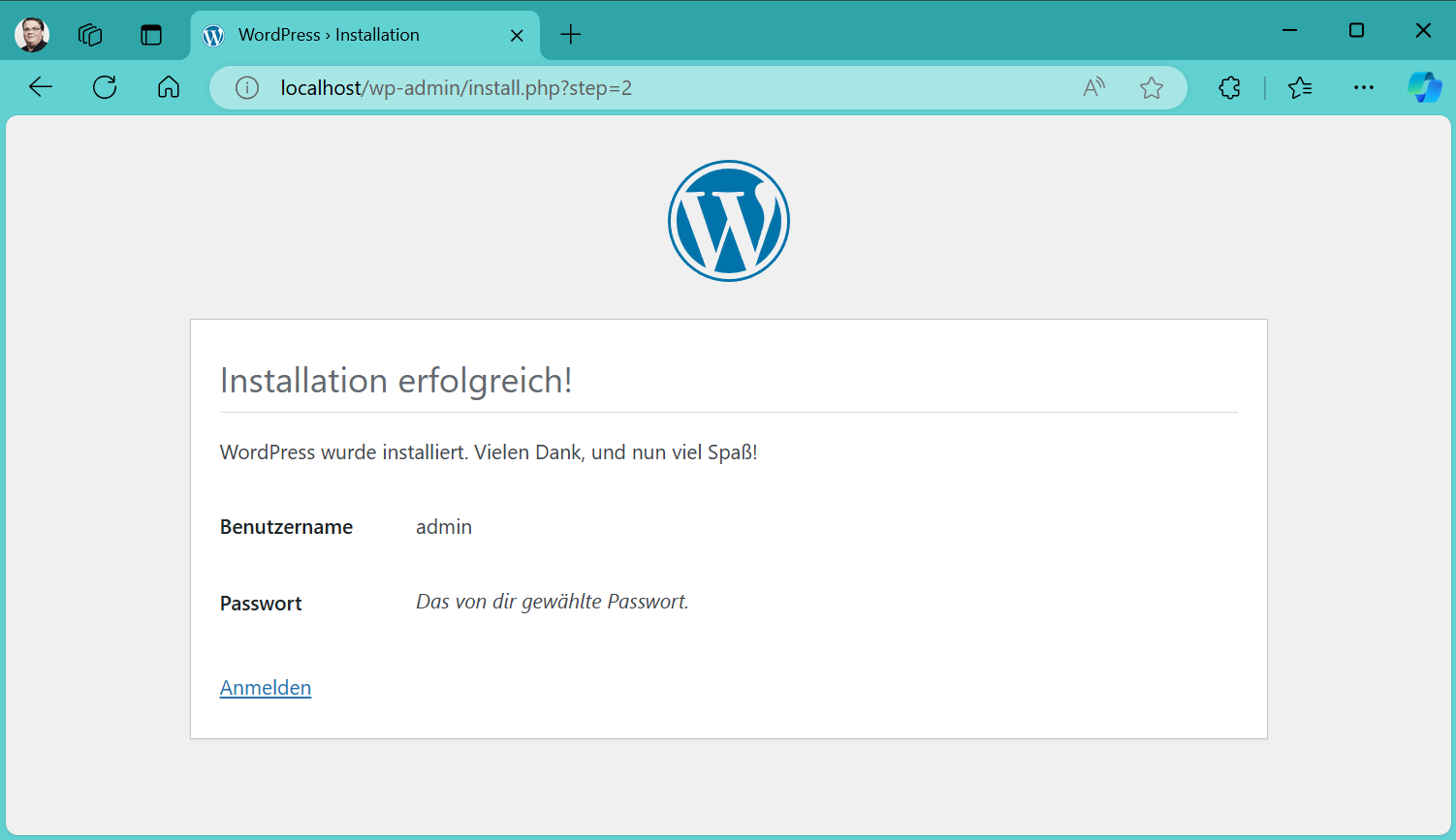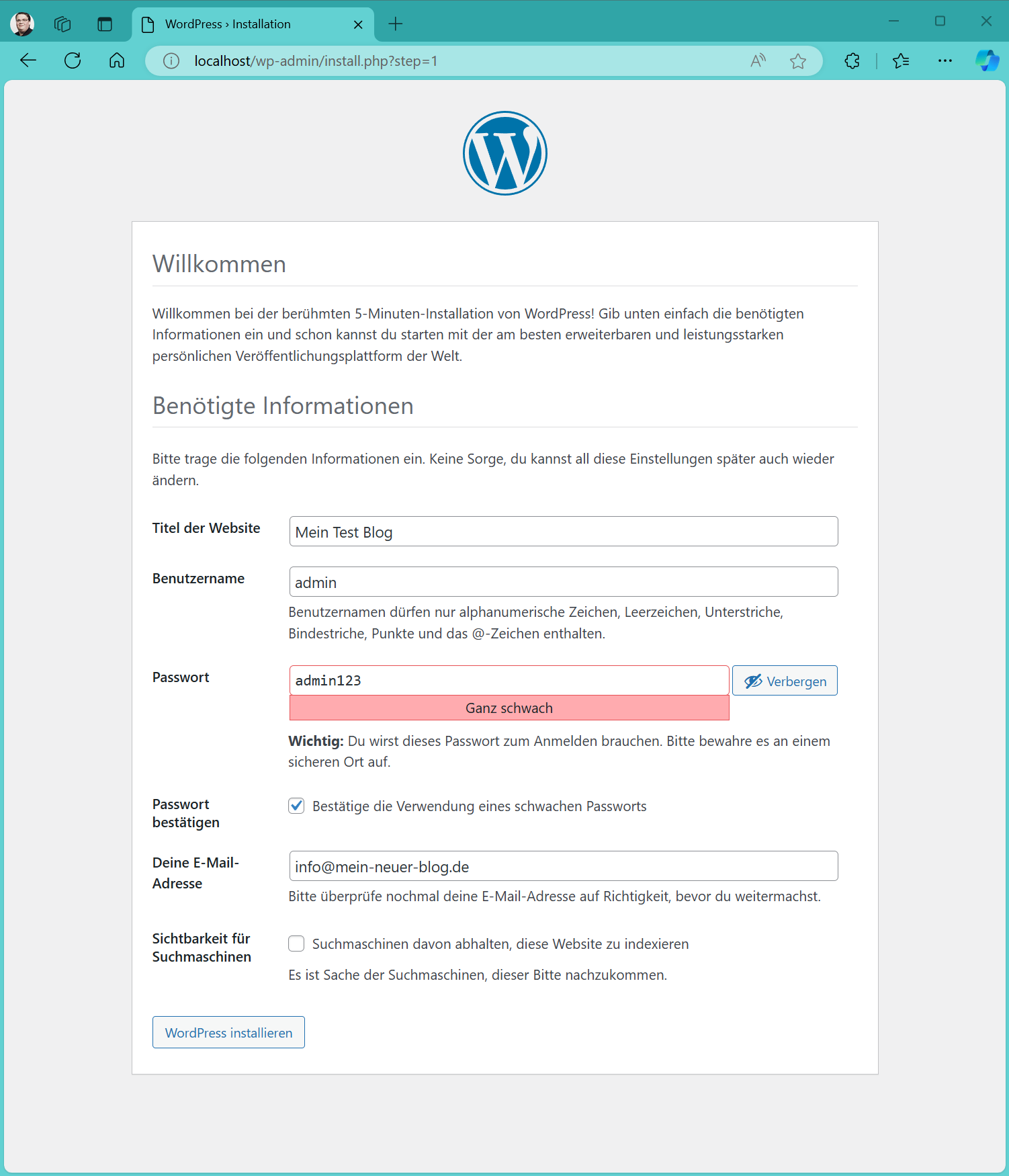 Da die Verbindung zur Datenbank in der Docker-Compose-Datei bereits eingerichtet ist, musst du keine zusätzlichen Datenbankinformationen eingeben. WordPress verbindet sich automatisch mit der MariaDB-Datenbank und legt die benötigten Tabellen an.