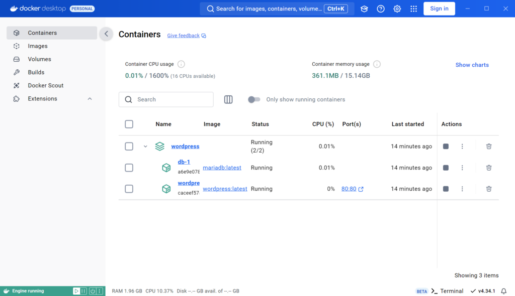 Dies startet die beiden Dienste: die MariaDB-Datenbank und die WordPress-Instanz. Der Datenbankdienst läuft im Hintergrund, und WordPress wird auf Port 80 erreichbar sein.