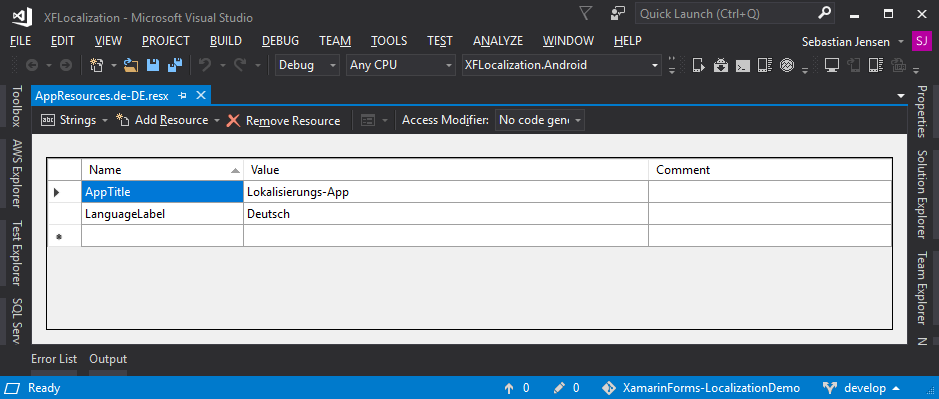 Zunächst legen wir ein ganz normales Xamarin.Forms Projekt in Visual Studio an. Anschließend fügen wir in dem portablen Part der App einen Ordner Resources and und darin dann eine Datei mit dem Namen AppResources.resx. Nach dem Öffnen der Datei können hier bequem die lokalisierten Texte eingetragen werden.