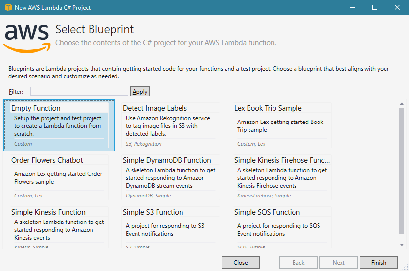 Es gibt bereits einige Vorlagen, auch Blueprints genannt, aber wir wollen alles von Hand erstellen und wählen daher im Wizard den Eintrag Empty Function aus und bestätigen mit einem Klick auf den Finish-Button.