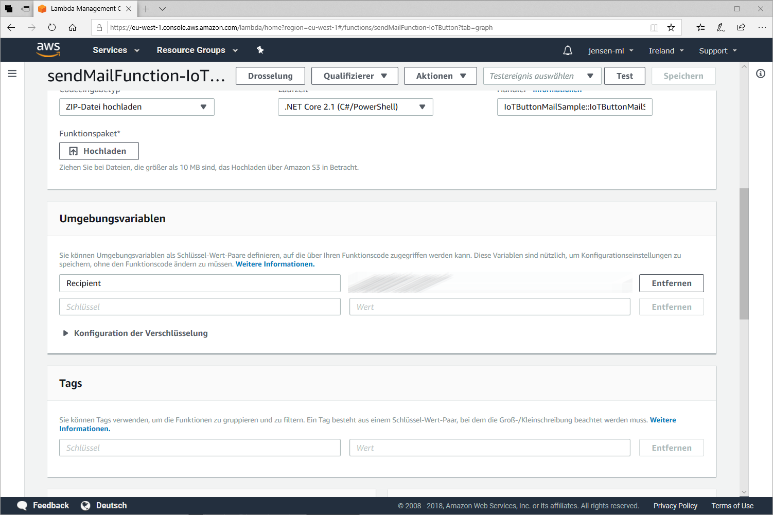 Wenn wir nun die Funktion öffnen müssen wir in den Umgebungsvariablen noch einen neuen Eintrag mit dem Schlüssel Recipient eintragen und als Wert eine Email-Adresse für den Empfänger der Nachrichten.
