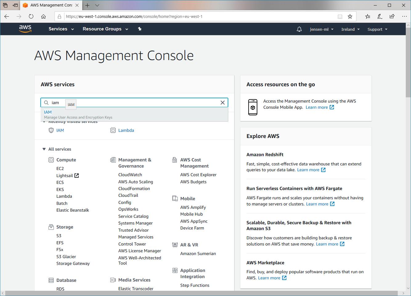 In der Suchleiste geben wir nun IAM ein, um in den Bereich zur Nutzerverwaltung zu gelangen.