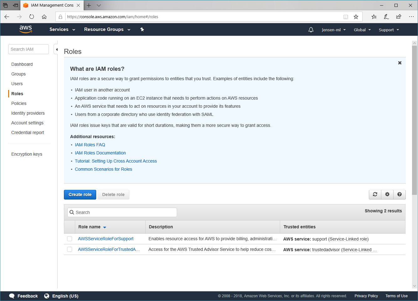 Da wir eine neue Rolle erstellen wollen, klicken wir auf den Button Create role, um diesen Prozess zu starten.