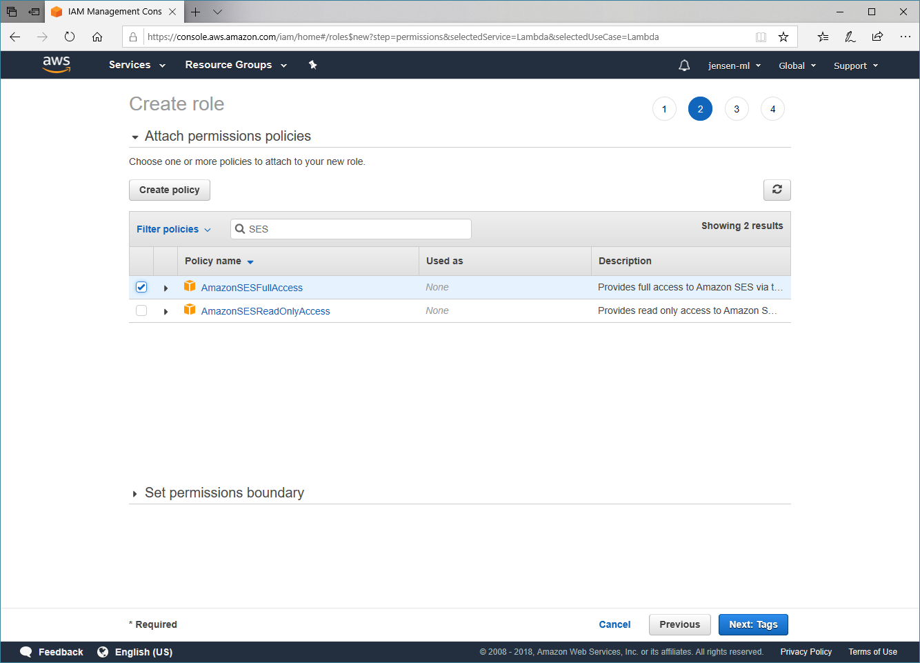 Wir fügen nun bereits vorhanden Berechtigungen hinzu. Hierfür filtern wir die verfügbaren Richtlinien nach SES und wählen den Eintrag AmazonSESFullAccess aus.