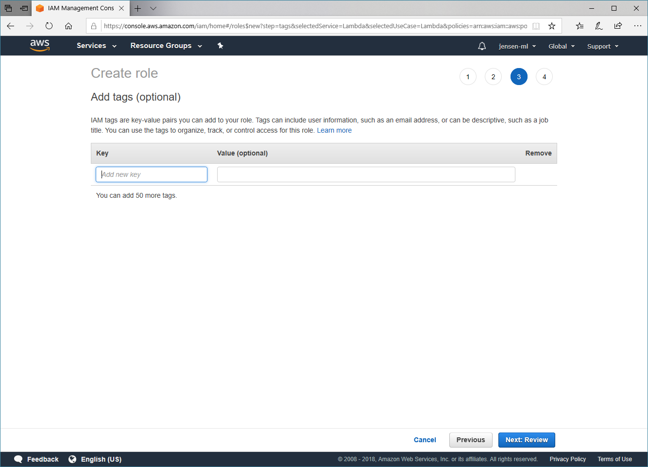 Den nächsten Schritt können wir mit Next: Review überspringen, da wir keine Tags in diesem Fall benötigen.