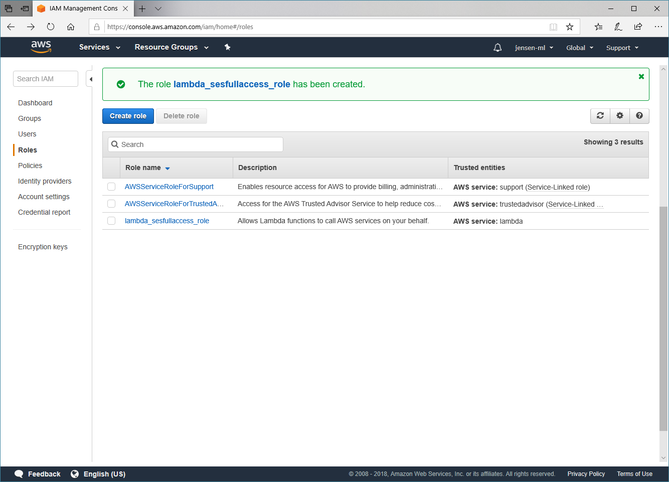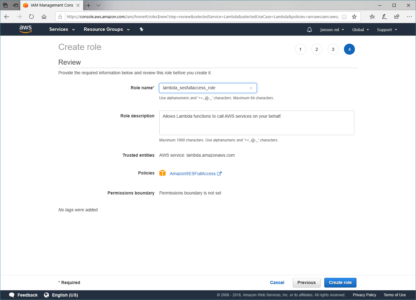 Nun können wir noch einen Rollen-Namen vergeben. Ich habe mir hier für lambda_sesfullaccess_role entschieden, denn so kann man direkt die Einstellungen der Role auf Grund des Namens wissen. Wir schließen den Prozess über den Button Create role ab.