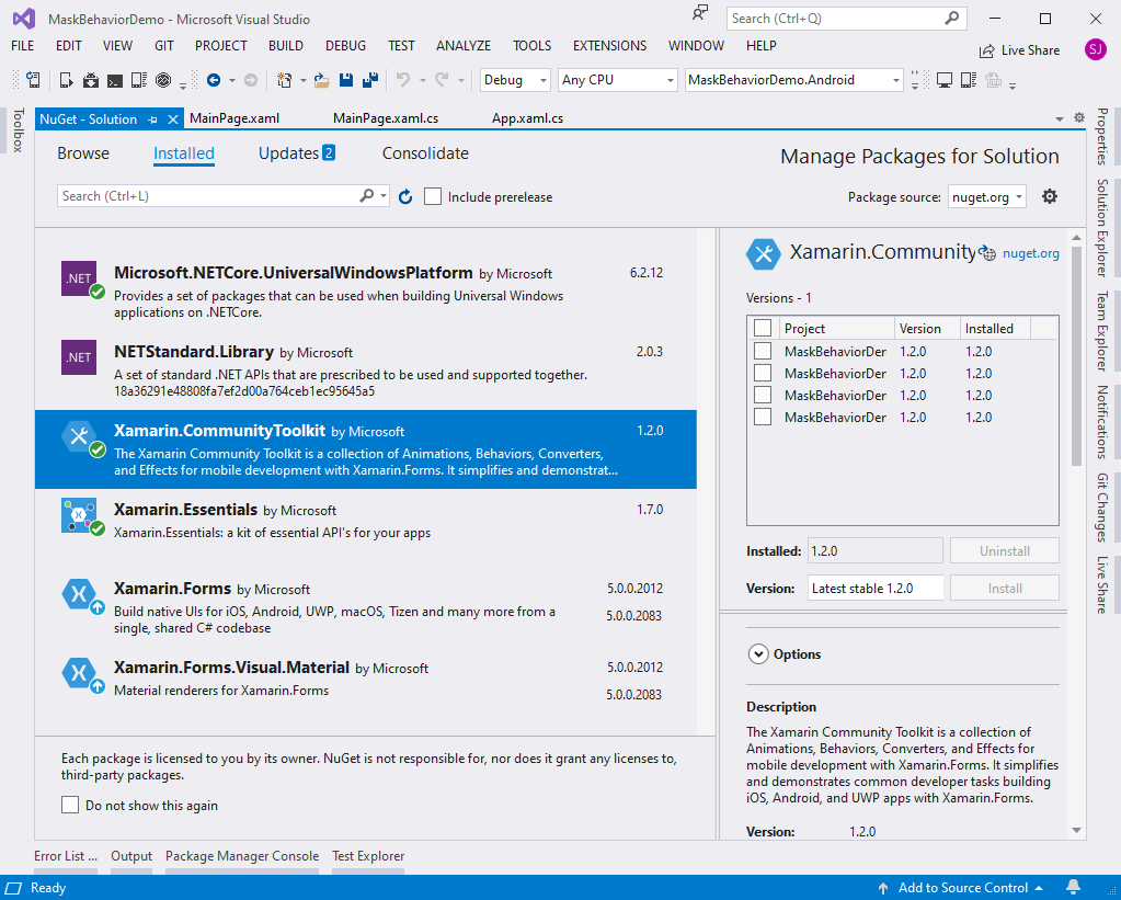 Ausgangslage bildet ein leeres Xamarin.Forms Projekt für Android, iOS und UWP. Wir müssen das Xamarin Community Toolkit NuGet-Paket allen vier Projekten hinzufügen.