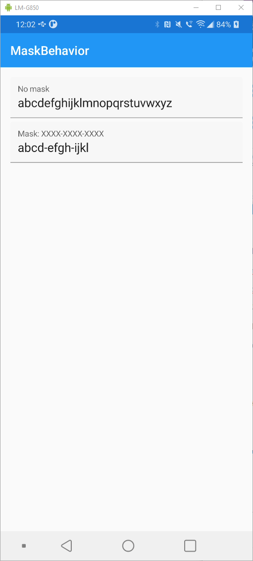 Ich habe noch ein weiteres Entry-Feld auf der MainPage platziert, bei dem ich nicht das Behavior verwende, um die Unterschiede zu zeigen. Der folgende Screenshot zeigt nun die View unter Android und die verschiedenen Entries.