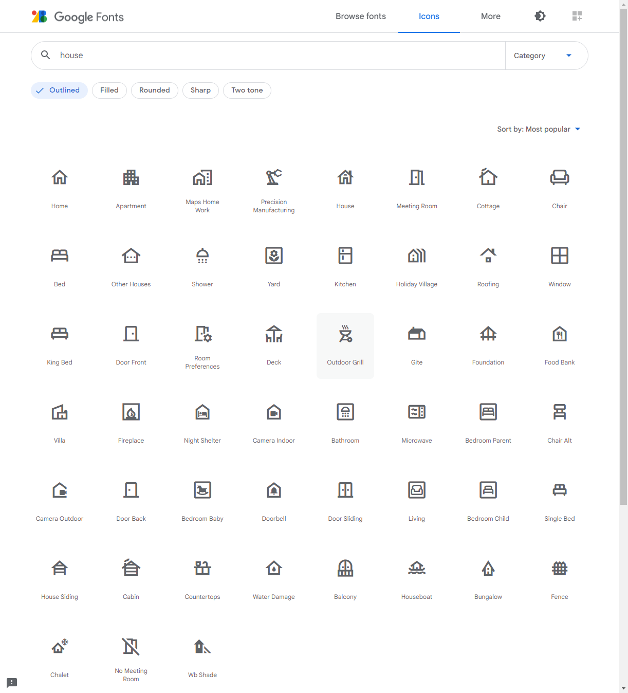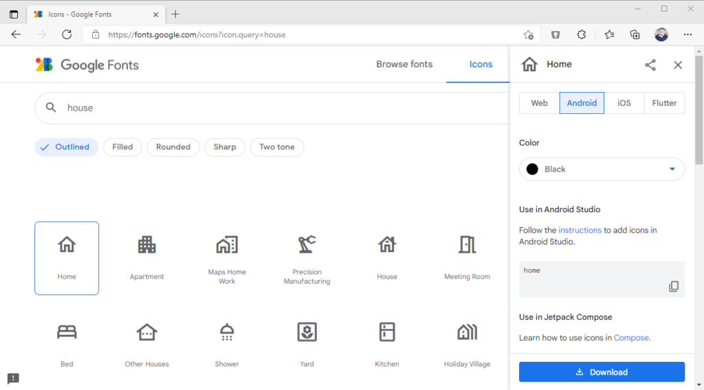 Auf der Webseite könnt ihr nun nach einem Schlagwort suchen, z.B. House und bekommt dann entsprechend eine gefilterte Liste angezeigt. Darüber hinaus könnt ihr auch den Darstellungsstil zwischen Outlined, Filled, Rounded, Sharp und Two tone wählen.
