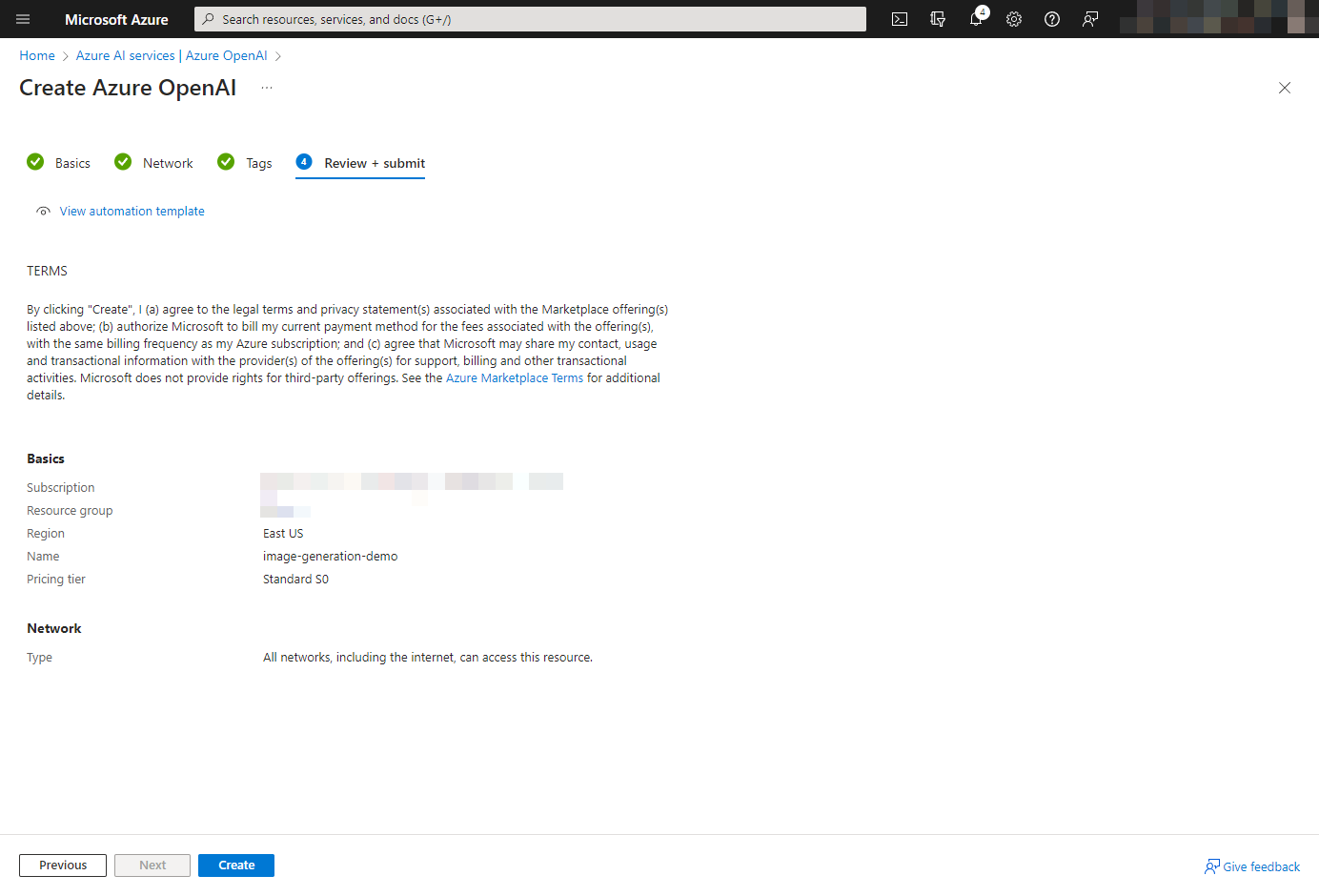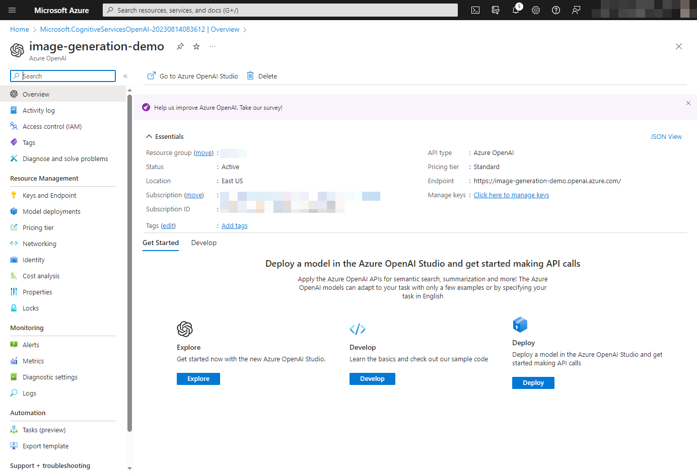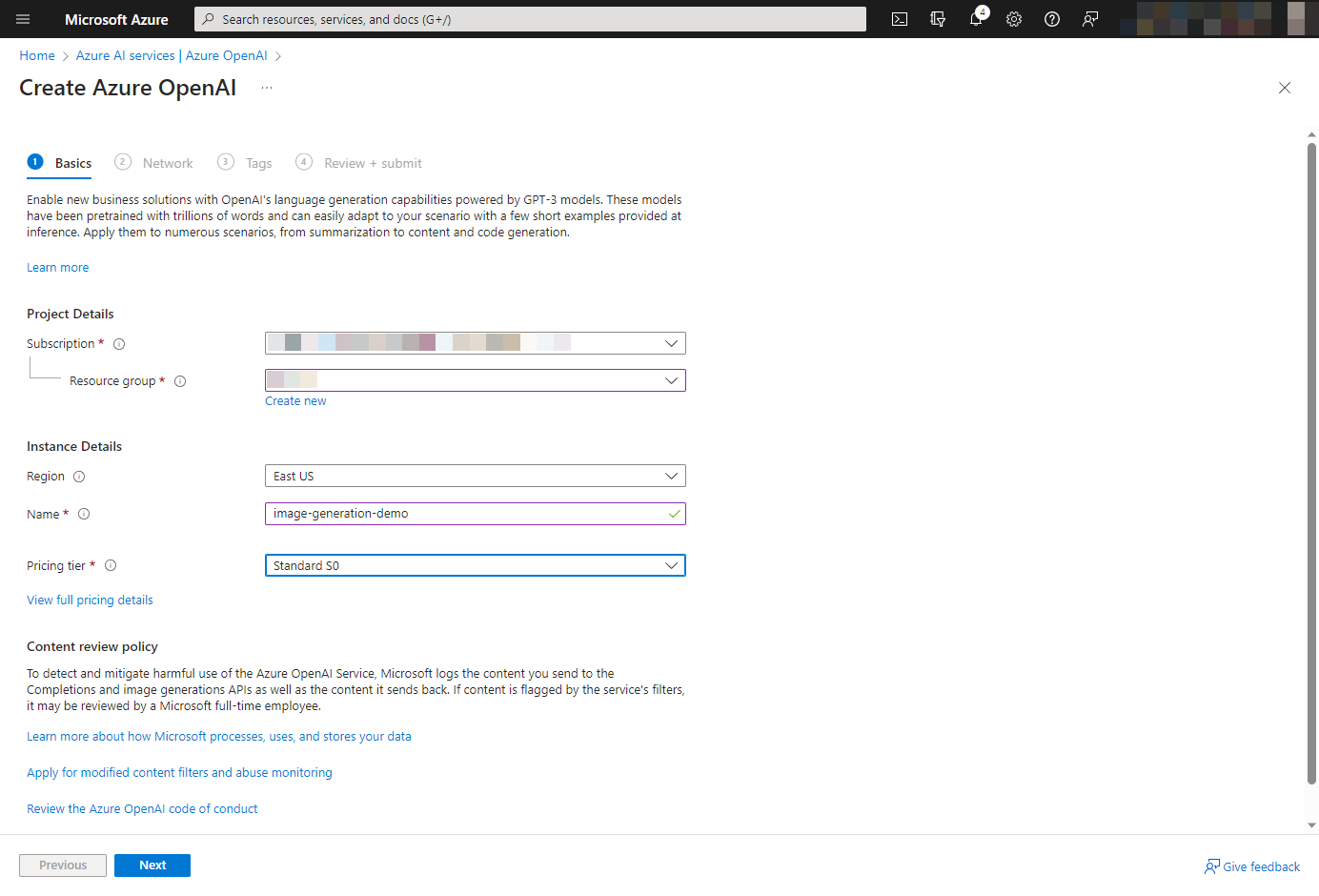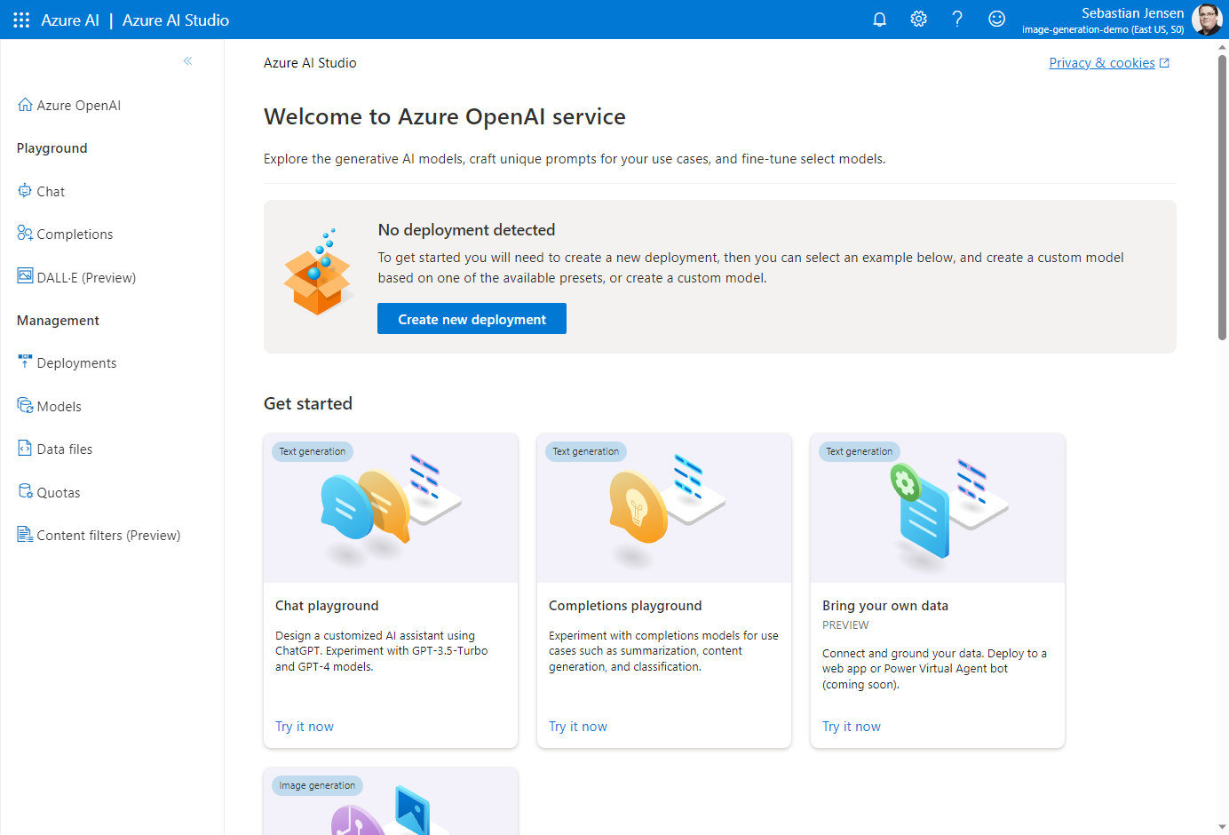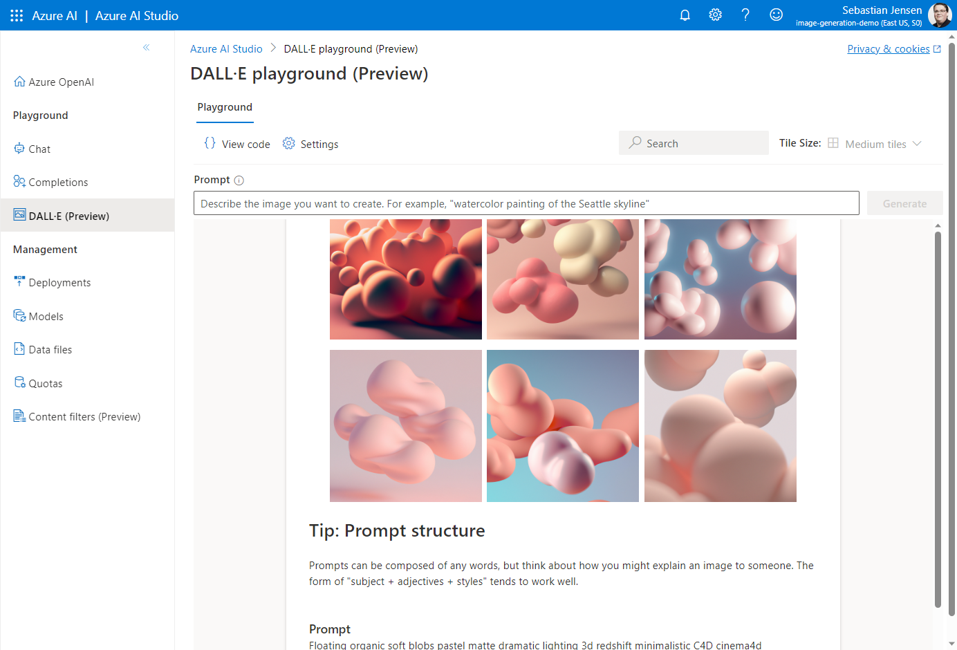 Derzeit ist DALL-E nur in der Region East US verfügbar, daher achte darauf, East US auszuwählen.