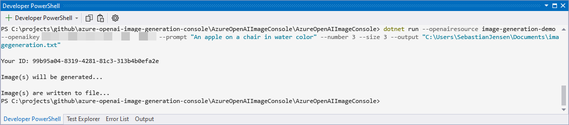 Wenn die Löschoption nicht angegeben ist, erstellen wir die HttpRequestMessage und senden sie an die API. Wir erhalten eine ID als Antwort, die auf der Konsole ausgegeben wird. Anschließend müssen wir regelmäßig überprüfen, ob die Bilder generiert wurden. Wenn dies der Fall ist, schreiben wir die URLs in die angegebene Ausgabedatei.