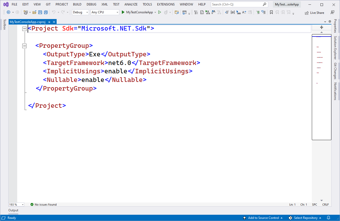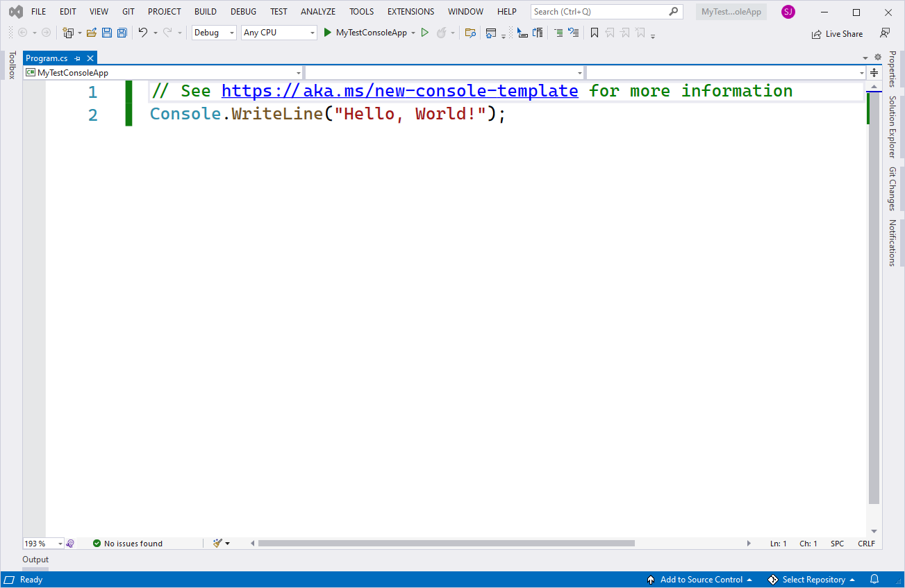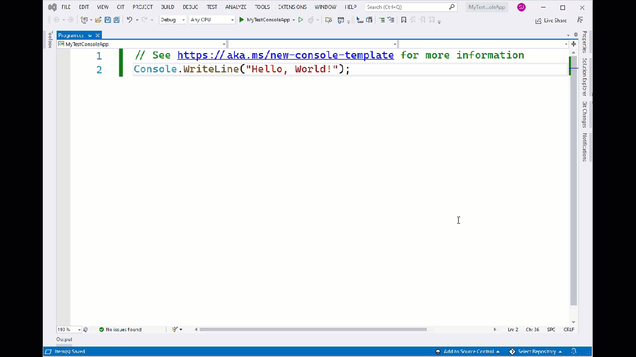 Ich habe hier bereits eine leere Konsolen-App mit .NET6 als Framework angelegt und auf dem ersten Blick lassen sich direkt Änderungen erkennen, denn die leere Vorlage besteht nur noch aus einer einzelnen Code-Zeile. Es werden also keine usings, kein Namespace, keine Klasse und auch keine Main-Methode mehr benötigt, aber das Ergebnis ist das gleiche.