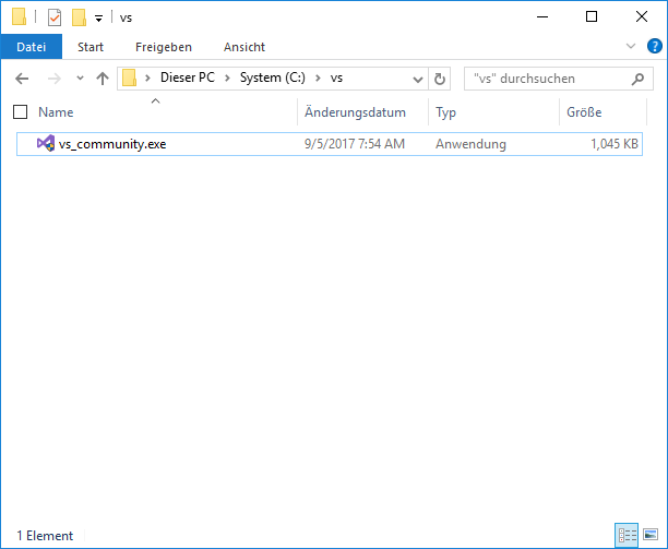 Den Installer speichere ich lokal auf der Festplatte in einem eigenen Ordner. Den Dateinamen habe ich angepasst, so dass die Datei nun nur noch vs_community.exe heißt.