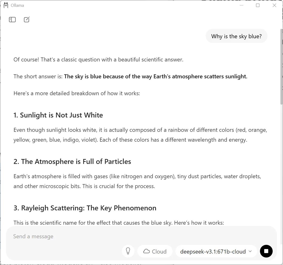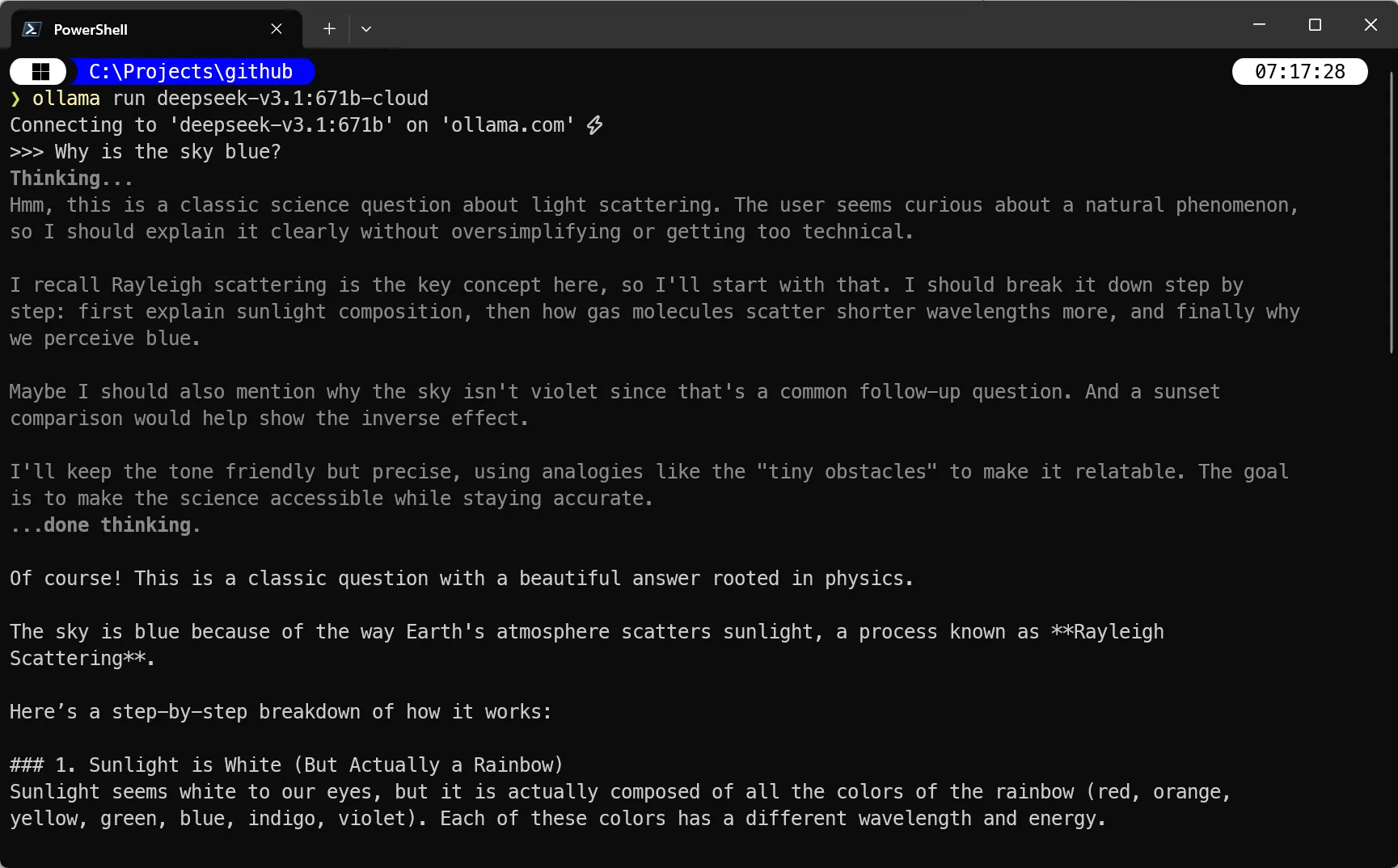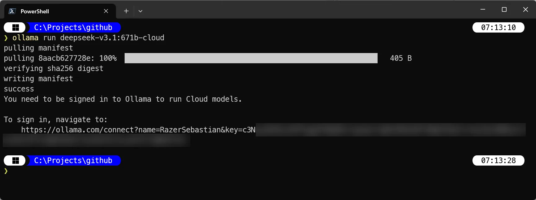 Danach kann man ein Cloud-Modell starten, z.B. ollama run deepseek-v3.1:671b-cloud