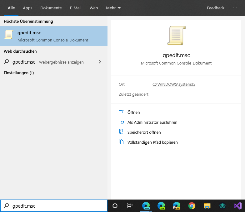 Zunächst öffnen wir den Editor für lokale Gruppenrichtlinien. Hierzu öffnen wir das Startmenü und geben gpedit.msc ein.
