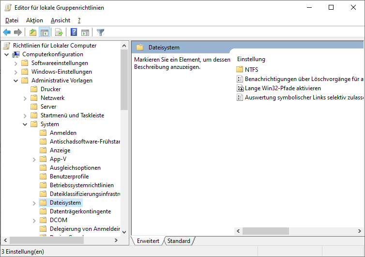 Nun wählen wir den folgenden Pfad aus: Richtlinien für Lokaler Computer > Computerkonfiguration > Administrative Vorlagen > System > Dateisystem.