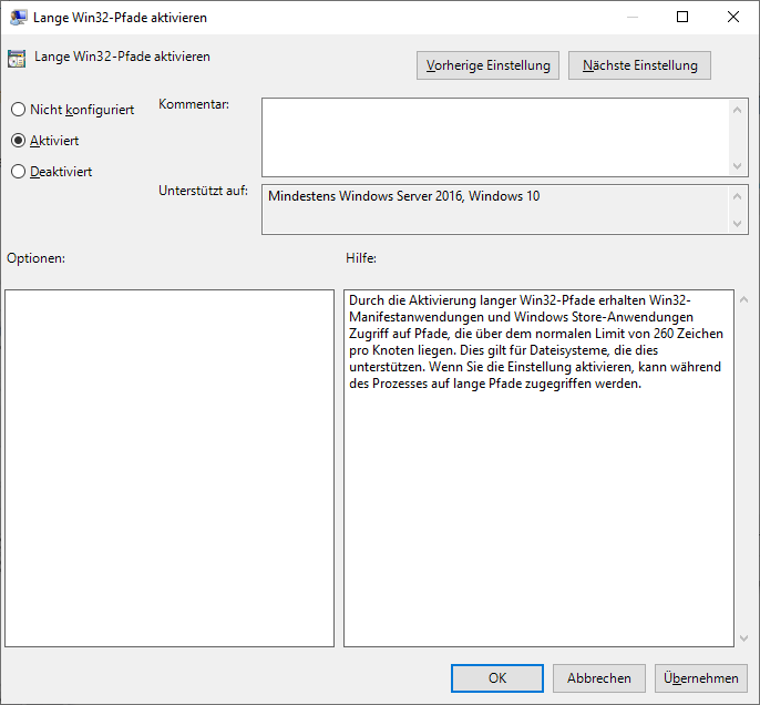 Im rechten Bereich befindet sich jetzt die Option Lange Win32-Pfade aktivieren, welche wir per Doppelklick öffnen werde. Anschließend aktivieren wir die Option und bestätigen die Änderung über den Button Übernehmen.