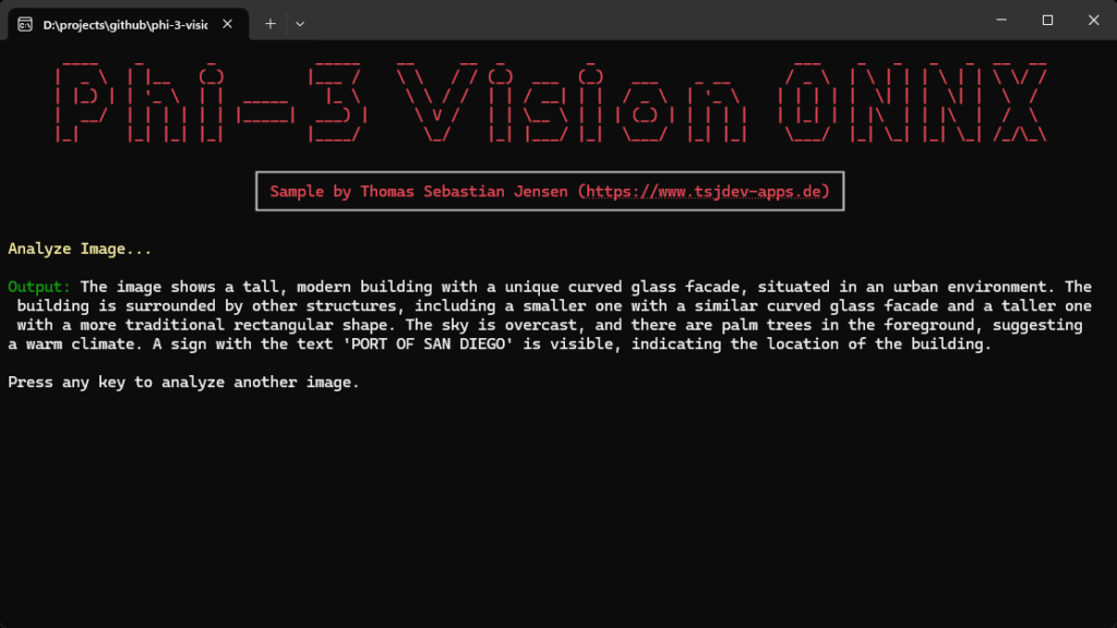 Durch Befolgen der in diesem Leitfaden beschriebenen Schritte hast du das Phi-3 Vision-Modell erfolgreich mithilfe von ONNX in eine .NET-Konsolenanwendung integriert.