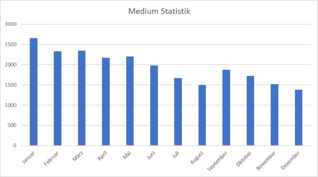 Auf Medium war ich leider im Jahr 2021 gar nicht aktiv und so wurde keine Story von mir veröffentlicht. Dort schreibe ich bekanntlich auf Englisch und somit fallen auch die Zahlen etwas größer aus. Insgesamt konnte ich aber trotzdem über 25.000 Leserinnen und Leser für meine Beiträge begeistern.