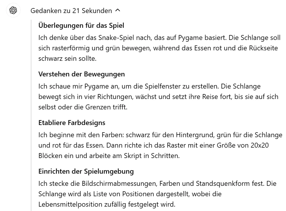 Ihr seht also, dass ich recht präzise bin mit meinen Anweisungen. Ich gehe kurz auf die Steuermöglichkeit des Nutzers drauf ein und bestimmte die Farben für den Hintergrund, die Schlange und das Essen. Darüber hinaus beschreibe ich noch kurz die Funktionsweise und gebe an, dass nur PyGame als Library verwendet werden soll.