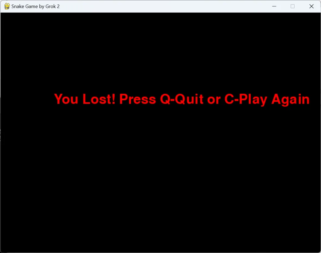 Anders als bei den OpenAI-Modellen muss der Nutzer zunächst eine Taste drücken, um das Spiel zu starten. Dies empfinde ich als sehr praktisch, aber es war natürlich auch keine Anforderung. Die Schwierigkeit dieses Spiels ist deutlich höher, da die Geschwindigkeit einfach höher ist. Darüber hinaus hat man nachdem Verlieren noch die Möglichkeit das Spiel zu beenden oder aber eine neue Runde zu starten.