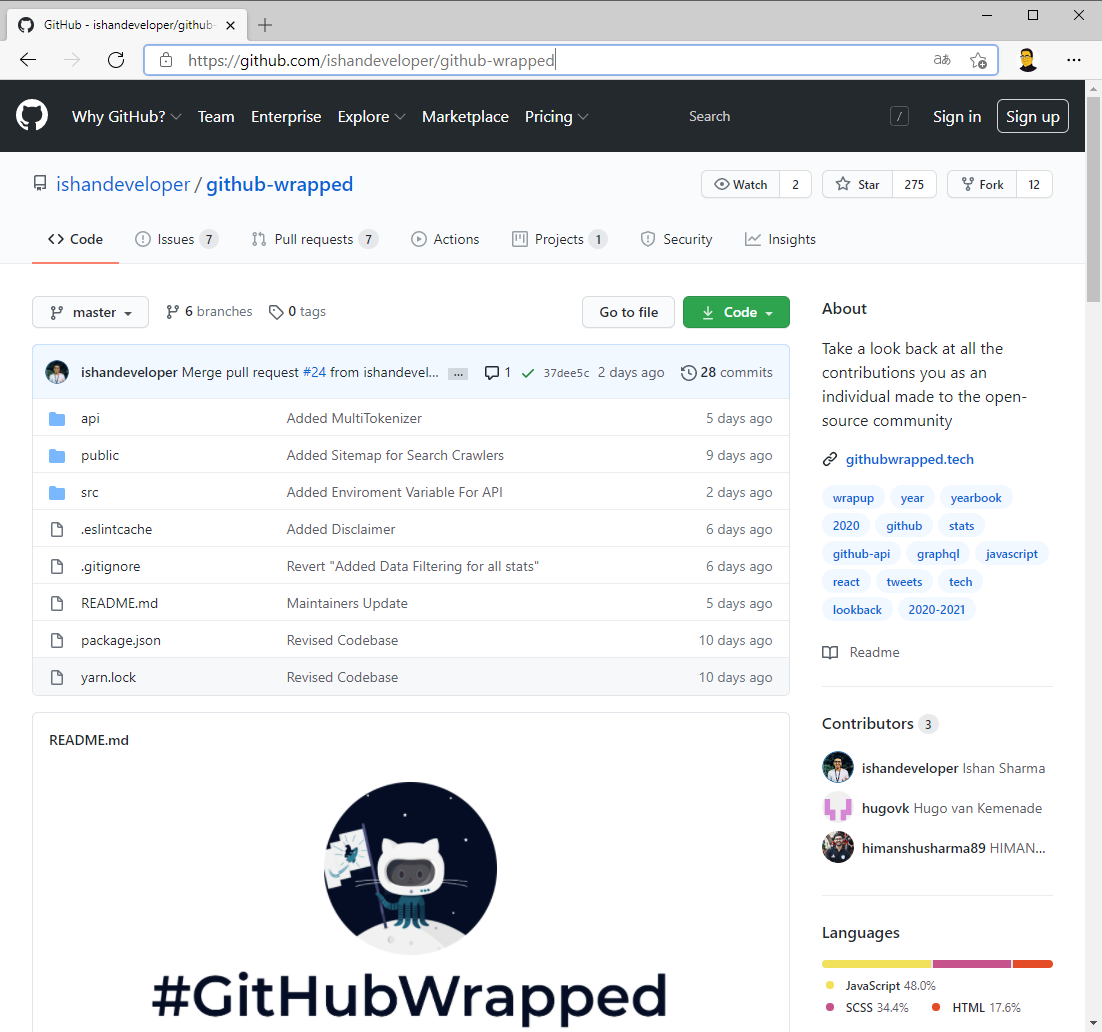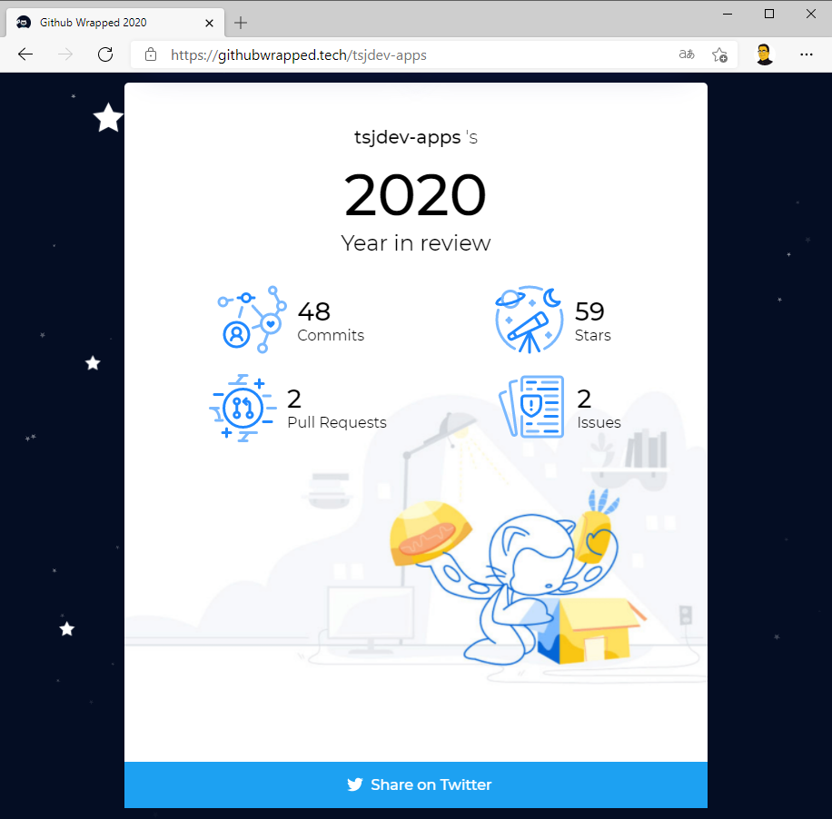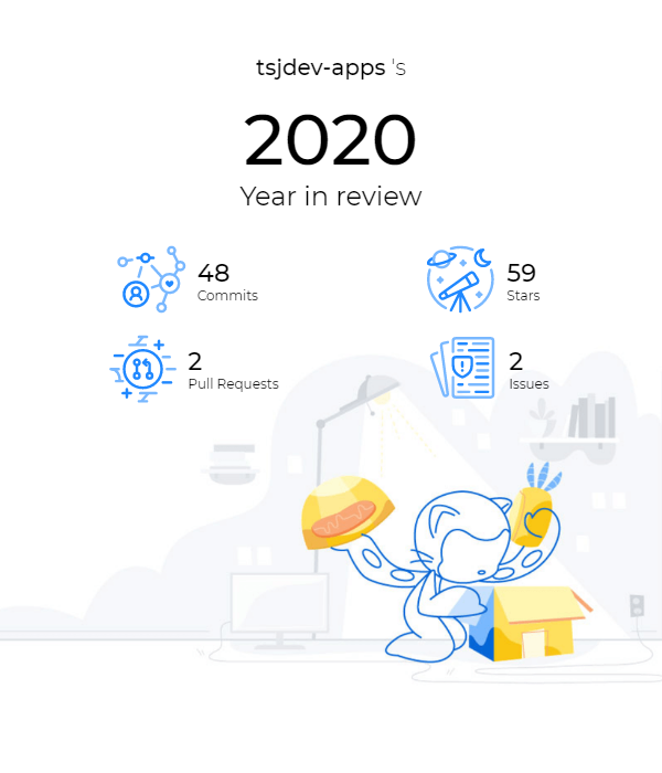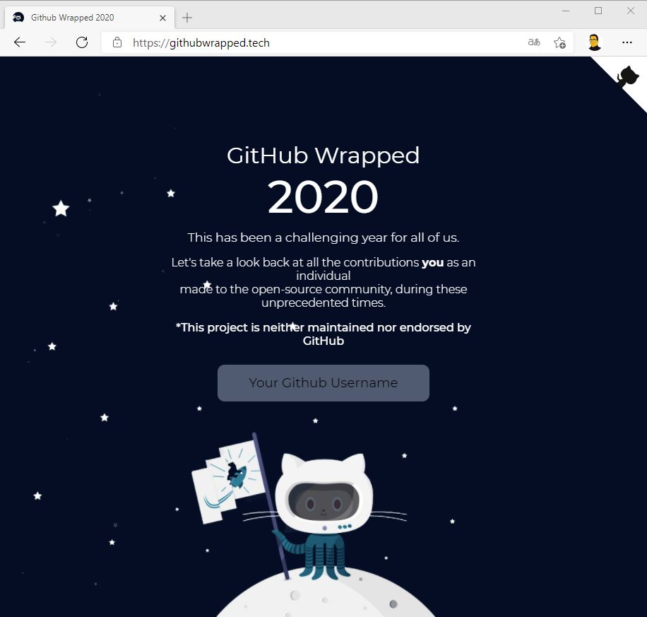 In meinem letzten Blog-Beitrag habe ich euch ja einen persönlichen Rückblick in das Jahr 2020 gegeben. Nun bin ich über eine Webseite gestoßen, welche euch ebenfalls einen Rückblick auf das Jahr 2020 aus der Sicht von GitHub gibt. Hierzu braucht ihr nur die Webseite githubwrapped.tech aufrufen und euren GitHub-Nutzernamen eintragen. Anschließend werden euch die Anzahl der Commits, die Anzahl der verteilten Stars, die Anzahl der Pull Requests, sowie die Anzahl der erstellten Issues angezeigt.