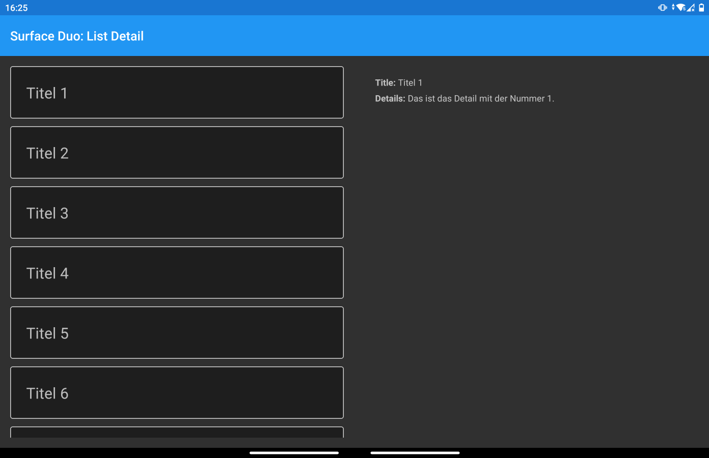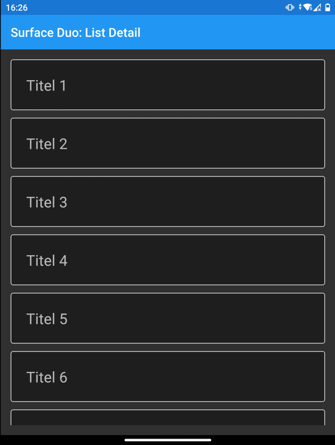Wenn wir die App nun erneut ausprobieren, stellen wir fest, dass im Single Screen noch nicht viel passiert, aber wenn wir die App nun über beide Screens aufspannen, dann aktualisiert sich jetzt auch das Detail entsprechend. Aber wenn die App auf einem Gerät mit nur einem Screen ausgeführt wird, ist die App noch nicht wirklich funktional. Daher kehren wir zurück zu unserem Code, um auch hier dieses Problem zu lösen.