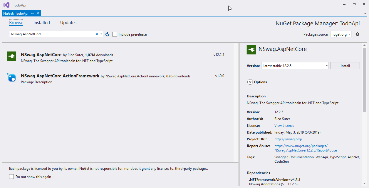 Zum Einsatz kommt hier Swagger und die Integration ist sehr einfach. Zunächst öffnen wir wieder unsere Solution mit unserer API und wir öffnen den NuGet-Manager, weil wir ein neues NuGet-Package hinzufügen wollen. Wir benötigen das Package NSwag.AspNetCore .