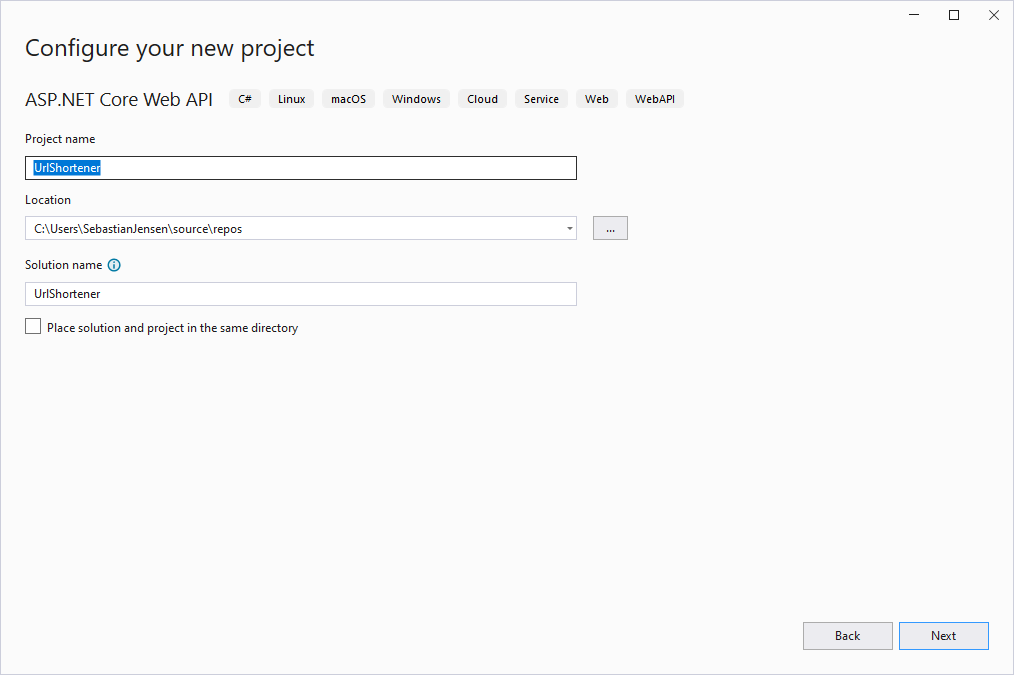 Anschließend geben wir dem Projekt einen Namen, z.B. UrlShortener.