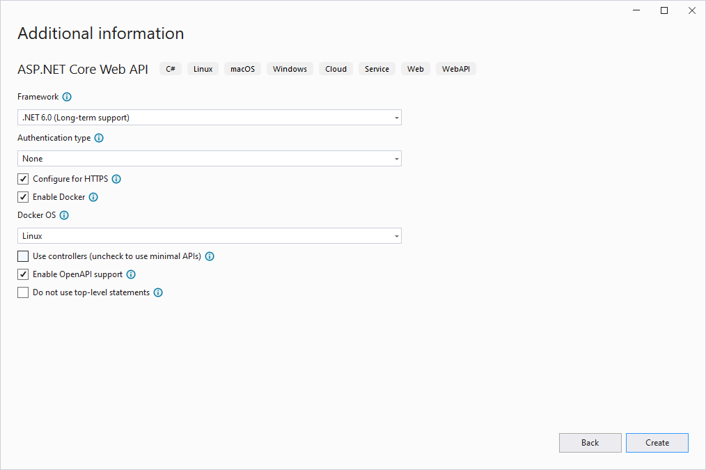 Im anschließenden Dialog können wir noch ein paar weitere Details konfigurieren. Hier stellen wir sicher, dass der Haken bei Enable Docker gesetzt ist, so dass wir unser Projekt später ganz einfach als Docker Container laufen lassen können. Außerdem entfernen wir noch den Haken bei Use controllers (uncheck to use minimal APIs), so dass wir tatsächlich eine minimale API als Vorlage haben.