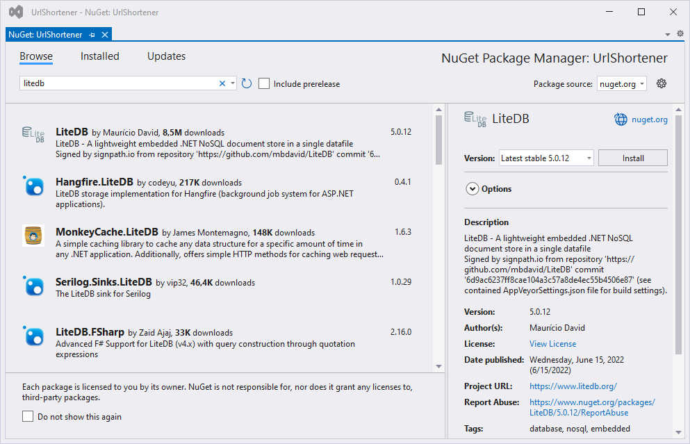 Wir wechseln auf den Tab Browse und suchen nach LiteDB . Anschließend fügen wir das Package unserem Projekt hinzu.