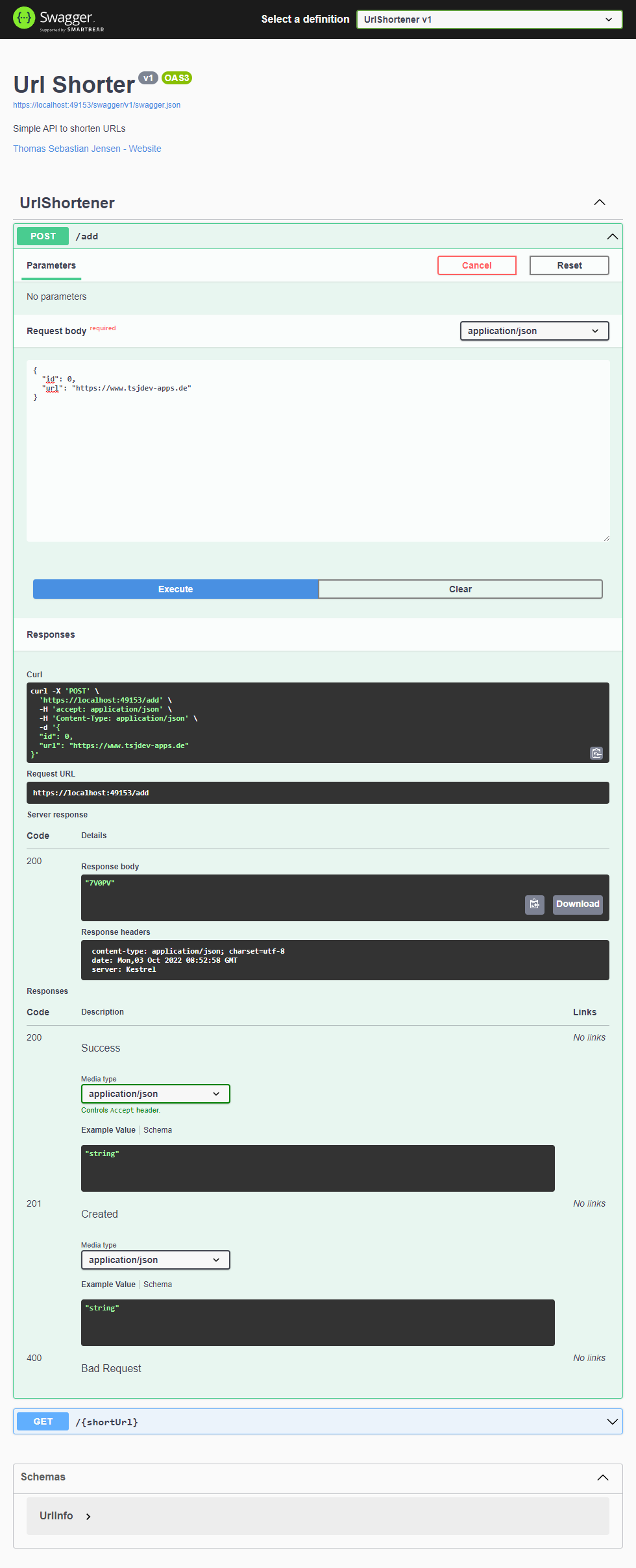 Schauen wir uns das ganze doch nun einmal an. Solltet ihr Docker Desktop auf eurem Rechner installiert haben, so könnt ihr die Docker-Variante starten oder ansonsten klassisch die UrlShortener-Variante. Es sollte sich die Swagger-Dokumentation öffnen und hier können wir die beiden Endpunkte direkt testen. Ich habe meine Webseite