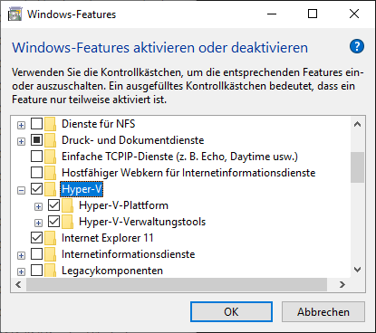 Microsoft stellt auf der Webseite die virtuellen Maschinen für verschiedene Virtualisierungs-Tools bereit. In meinem Fall habe ich mich für Hyper-V entschieden. Dieses Feature müsst ihr gegebenenfalls auf eurem Windows 10 Gerät noch aktivieren. Dafür sucht ihr im Suchfeld nach Feature und wählt den Eintrag Windows Features aktivieren oder deaktivieren aus. In der Liste müsst ihr nun schauen, dass das Häkchen bei Hyper-V gesetzt ist.