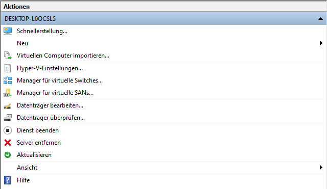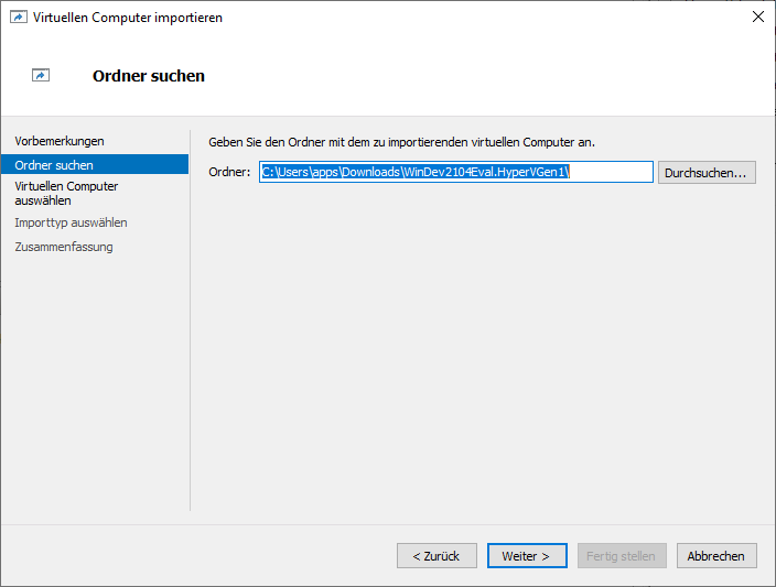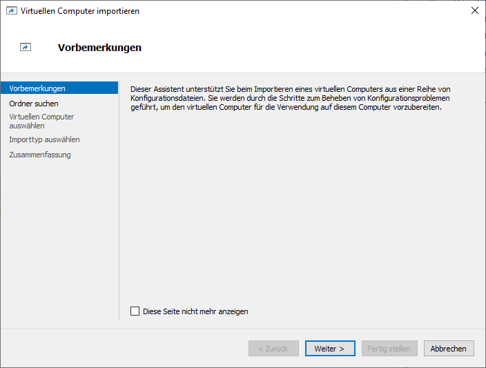 Nach dem Download braucht ihr die ZIP-Datei an einen beliebigen Ort entpacken und anschließend könnt ihr den Hyper-V Manager starten. Im rechten Menü findet ihr den Eintrag Virtuellen Computer importieren, welchen wir anklicken wollen.