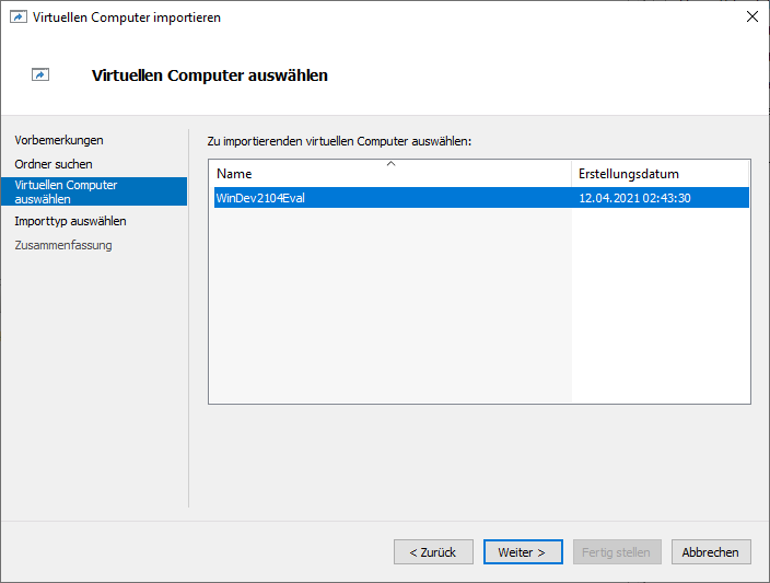 In der folgenden Übersicht wird euch nun der zu importierende virtuelle Computer angezeigt. Hier sollte nur ein Eintrag in der Liste vorhanden sein, welchen wir auswählen und wieder mit Weiterbestätigen.