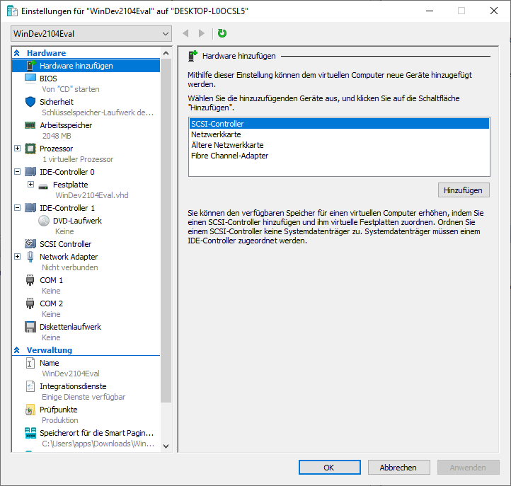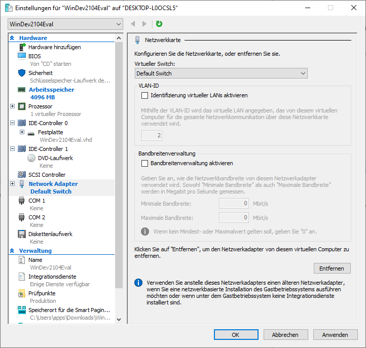 Damit die virtuelle Maschine auch über eine Internetverbindung verfügt, wähle ich unter Network Adapter den Default Switch aus.